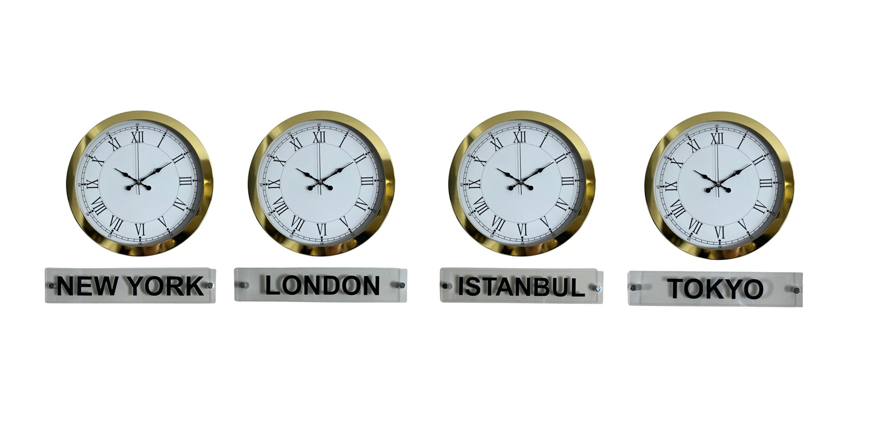 New York, London, İstanbul ve Tokyo şehirlerini aynı anda takip etmenizi sağlayan bu özel set; otel, ofis, resepsiyon ve kurumsal alanlar için hem dekoratif hem de profesyonel bir çözümdür.