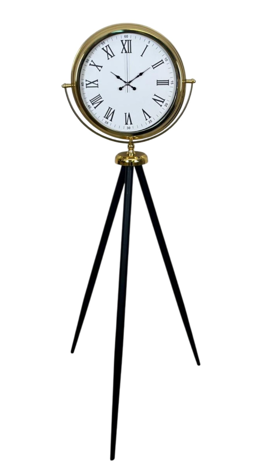 150 cm yüksekliği sayesinde yalnızca bir saat değil, aynı zamanda dekoratif bir obje olarak da kullanılır. Salon, ofis, lobi, otel, restoran ve vitrin gibi geniş alanlarda etkileyici bir görünüm sunar. Siyah tripod ayakları, gold gövde ile mükemmel bir kontrast oluşturarak modern ve dengeli bir tasarım ortaya koyar.