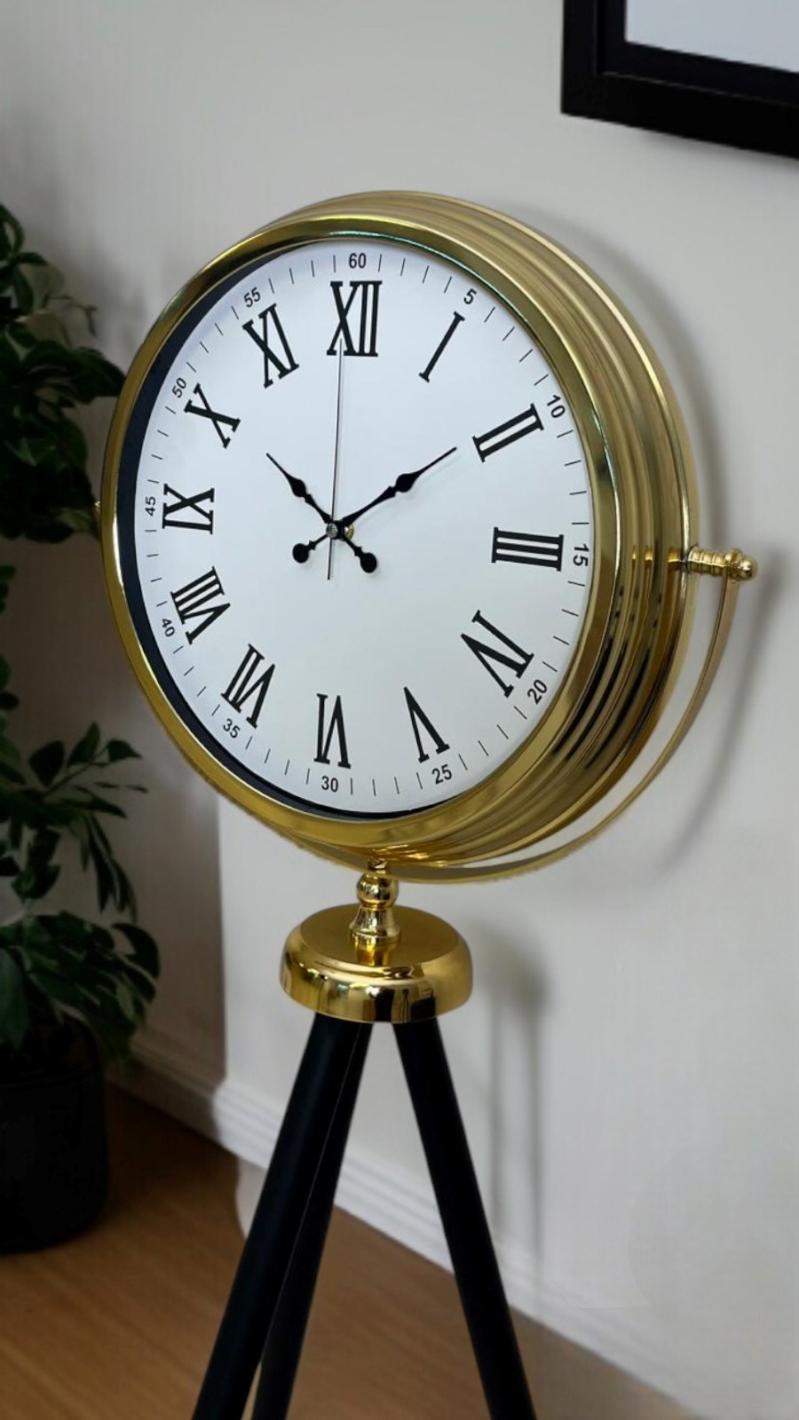Zamansız tasarımı, klasik Roma rakamları ve modern tripod ayak formuyla öne çıkan bu gold ayaklı saat, yaşam alanlarınıza güçlü bir karakter ve sofistike bir duruş kazandırır. Beyaz kadranı üzerinde yer alan Roma rakamları, saat tasarımına asil ve klasik bir hava katarken; parlak gold metal çerçevesi mekânda lüks bir odak noktası oluşturur.