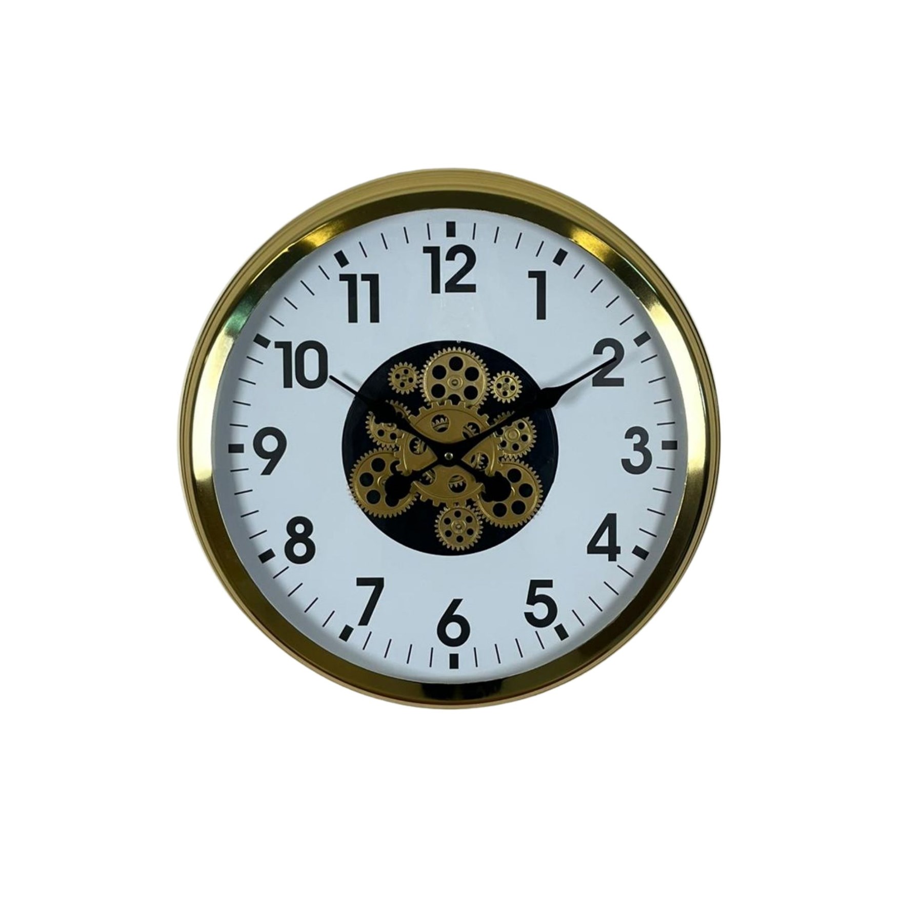 Parlak gold metal çerçevesi, beyaz kadranı ve merkezde yer alan hareketli çark mekanizması ile tasarlanan bu 60 cm duvar saati; modern ve lüks dekorasyon tarzını bir arada sunar.