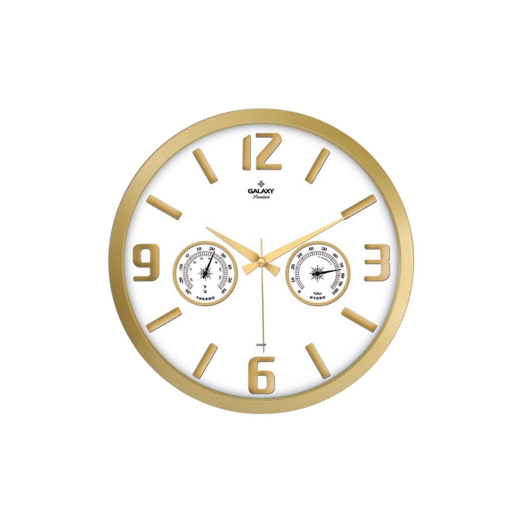 Şık tasarımı ve fonksiyonel özellikleriyle öne çıkan 39 cm Gold Termometre ve Nem Ölçerli Kabartma Rakamlı Duvar Saati, hem zamanı hem de ortam koşullarını takip etmenizi sağlar. Modern gold çerçevesi ve beyaz kadranı sayesinde dekorasyona zarif bir görünüm kazandırırken, kabartma rakamları sayesinde saatin kolay ve rahat okunmasını sağlar.