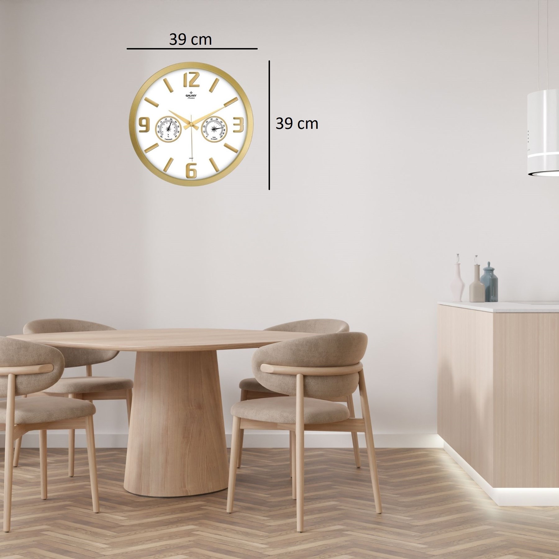 Saatin kadranında bulunan termometre ve higrometre göstergeleri, ortam sıcaklığını ve nem seviyesini ölçerek yaşam alanlarındaki hava koşullarını takip etmenize yardımcı olur. Bu özelliği sayesinde hem dekoratif hem de işlevsel bir kullanım sunar. Salon, mutfak, ofis ve çalışma alanlarında şık bir tamamlayıcıdır.