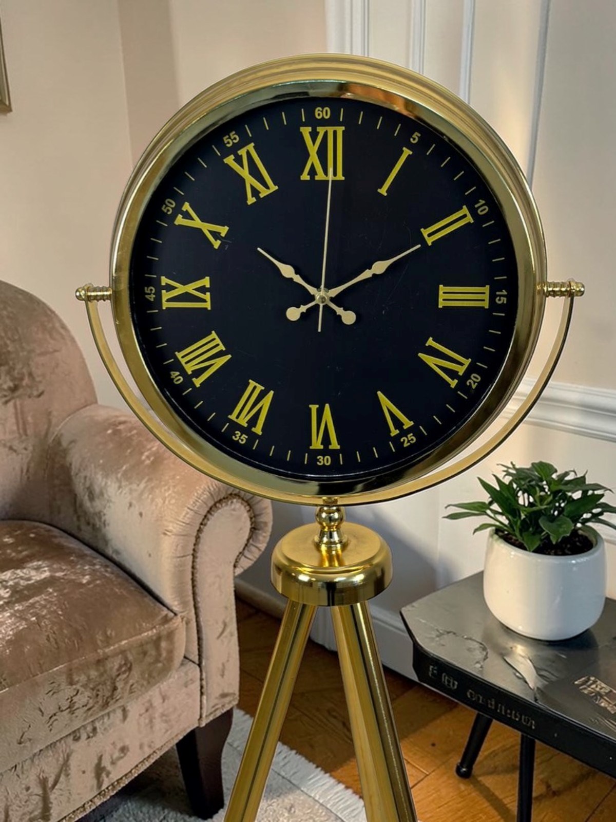 Modern tasarım ile klasik Roma rakamlarının zarafetini bir araya getiren Gold Tripod Ayaklı Saat, yaşam alanlarınıza şık ve dikkat çekici bir atmosfer kazandırır. İnce metal tripod ayak yapısı sayesinde dekoratif bir obje gibi durur ve salon, ofis, otel lobisi veya geniş yaşam alanlarında etkileyici bir görünüm oluşturur. Siyah kadran üzerinde yer alan altın renkli Roma rakamları saatin klasik estetiğini güçlendirirken, gerçek cam koruma sayesinde kadran uzun süre temiz ve net görünür.