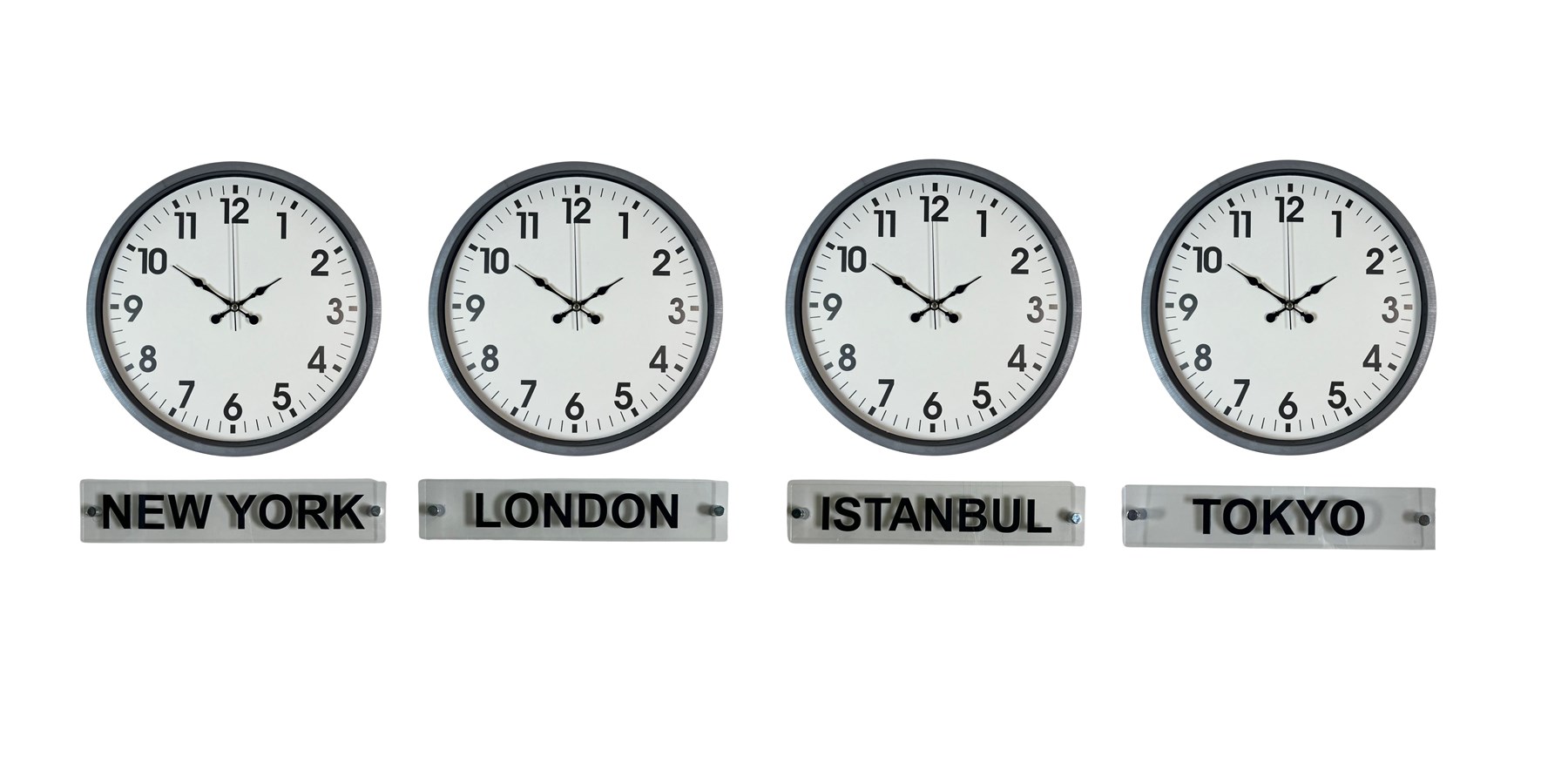 New York, London, Istanbul ve Tokyo saatlerini tek bir alanda sunan bu set, özellikle ofis, otel ve resepsiyon alanları için düzenli ve kurumsal bir görünüm oluşturur. Gri kasa rengi sayesinde farklı dekorasyon stilleriyle kolayca uyum sağlar.