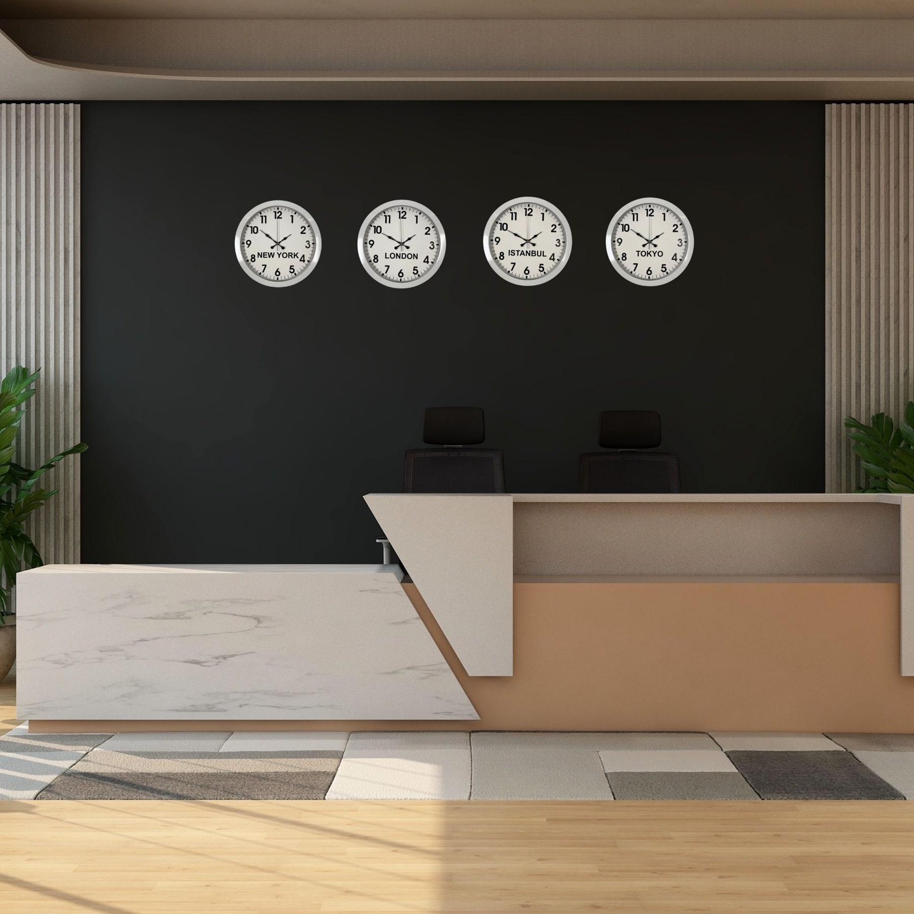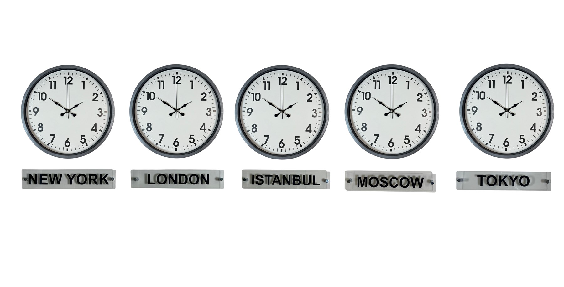 Modern ve dengeli tasarımıyla öne çıkan 36 cm 5’li tabelalı gri dünya saatleri, bulunduğu ortama sade ama güçlü bir kurumsal görünüm kazandırır. Farklı şehirlerin saatlerini aynı anda takip etme imkânı sunan bu özel set, özellikle ofisler, resepsiyon alanları ve profesyonel çalışma ortamları için ideal bir çözümdür.