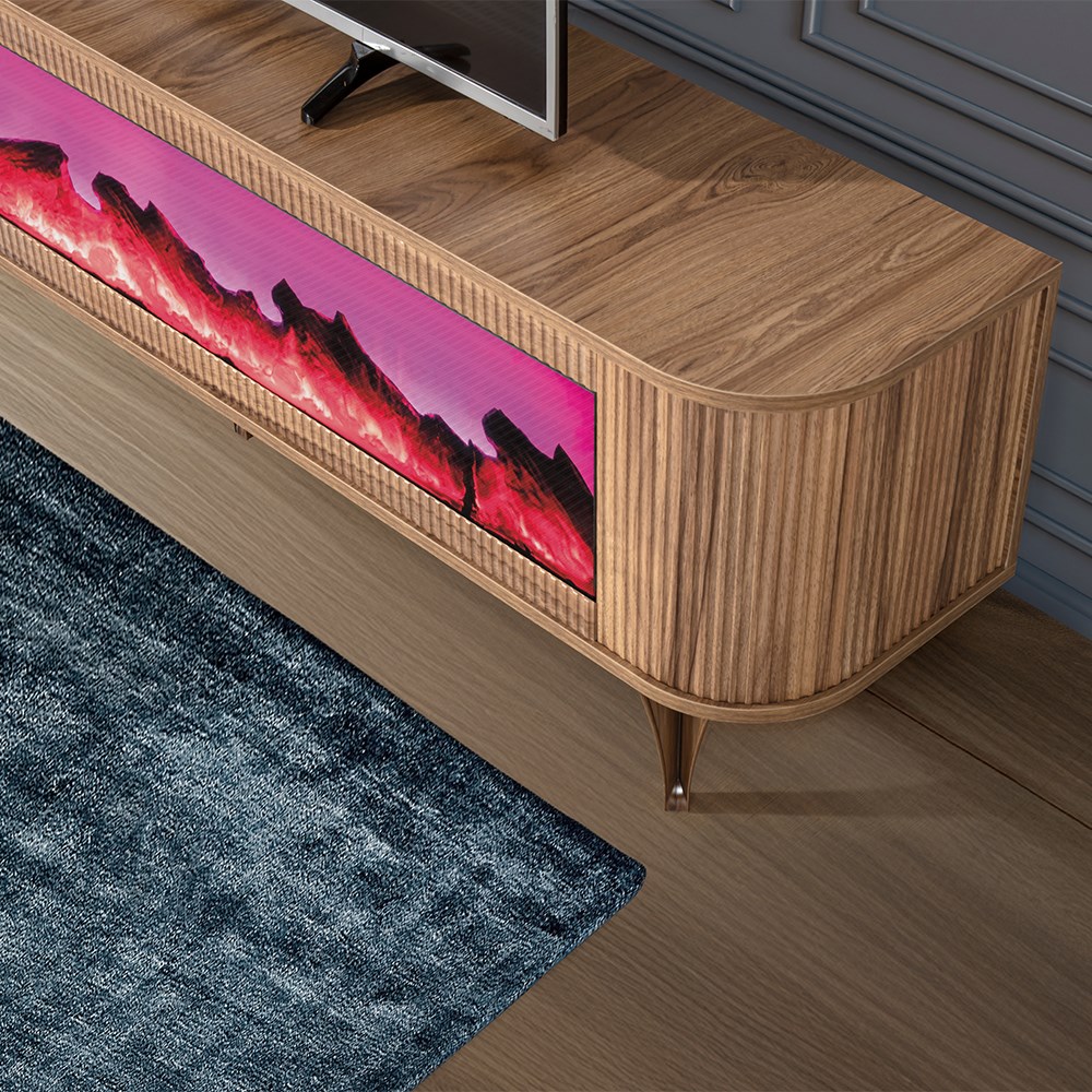 Gerçeğe yakın alev görünümlü şömine paneli, iç mekânda sıcak ve etkileyici bir ambiyans oluşturur.