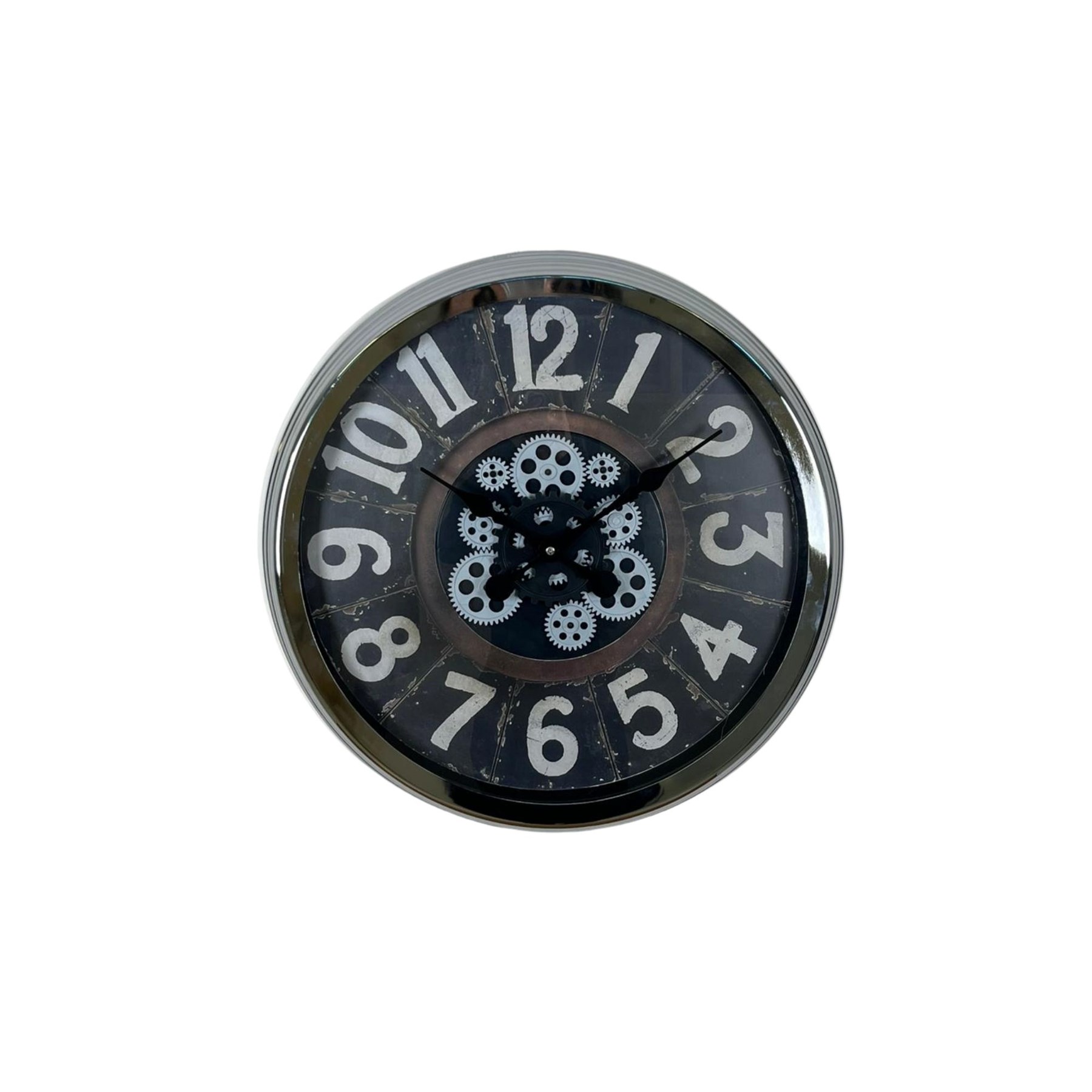 Krom parlak çerçevesi ışığı yansıtarak modern bir görünüm sunarken, merkezde yer alan hareketli çark mekanizması saate dinamik ve mekanik bir ruh katar. Salon, ofis, çalışma odası, kafe ve loft tarzı mekanlar için güçlü bir dekoratif tamamlayıcıdır.