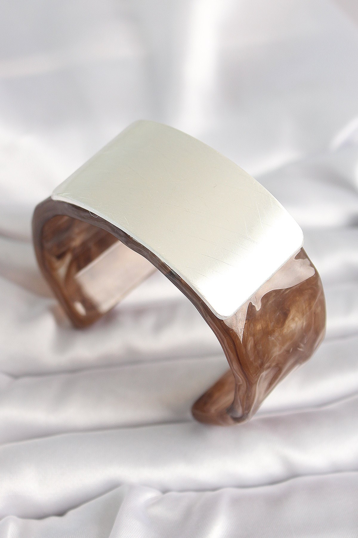 Kahverengi Mermer Desen Akrilik Plastik Gümüş Dikdörtgen Plaka Vintage Kadın Bilezik
