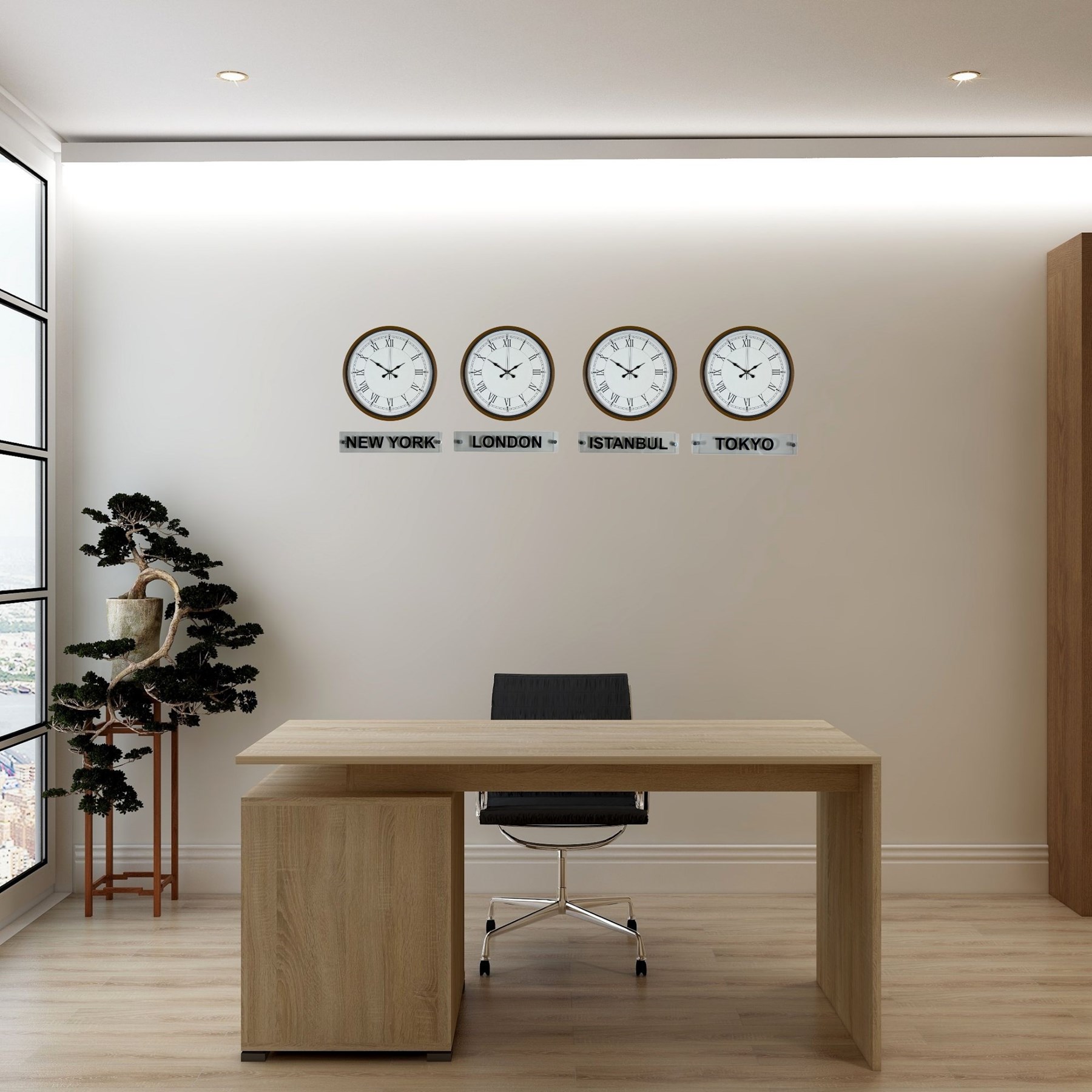 New York, London, Istanbul ve Tokyo saatlerini aynı anda takip etmenizi sağlayan bu özel set, özellikle ofis, otel, kafe ve resepsiyon alanları için hem dekoratif hem de işlevsel bir çözüm sunar. Alt kısmında yer alan şeffaf tabelalar, ürüne düzenli ve kurumsal bir görünüm kazandırır.