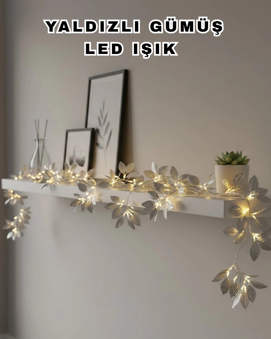 Yaldızlı Gümüş Yaprak Led Işık Pilli Dekoratif Ortam Ve Yılbaşı Aydınlatması