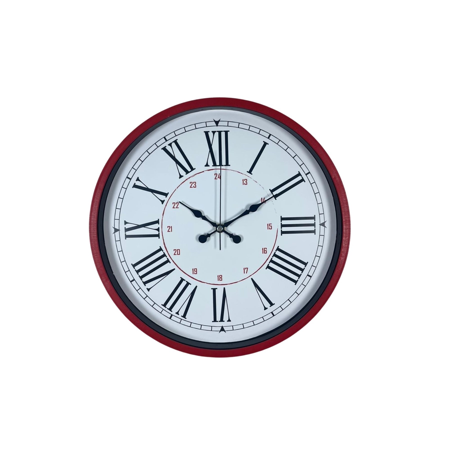 Canlı kırmızı kasası ve beyaz kadranı ile tasarlanan bu 36 cm duvar saati, klasik Romen rakam detaylarını güçlü ve dikkat çekici bir renk dokunuşuyla bir araya getirir. İç bölümde yer alan kırmızı 24 saat göstergesi sayesinde standart saatlerden ayrılır ve daha fonksiyonel bir kullanım sunar.