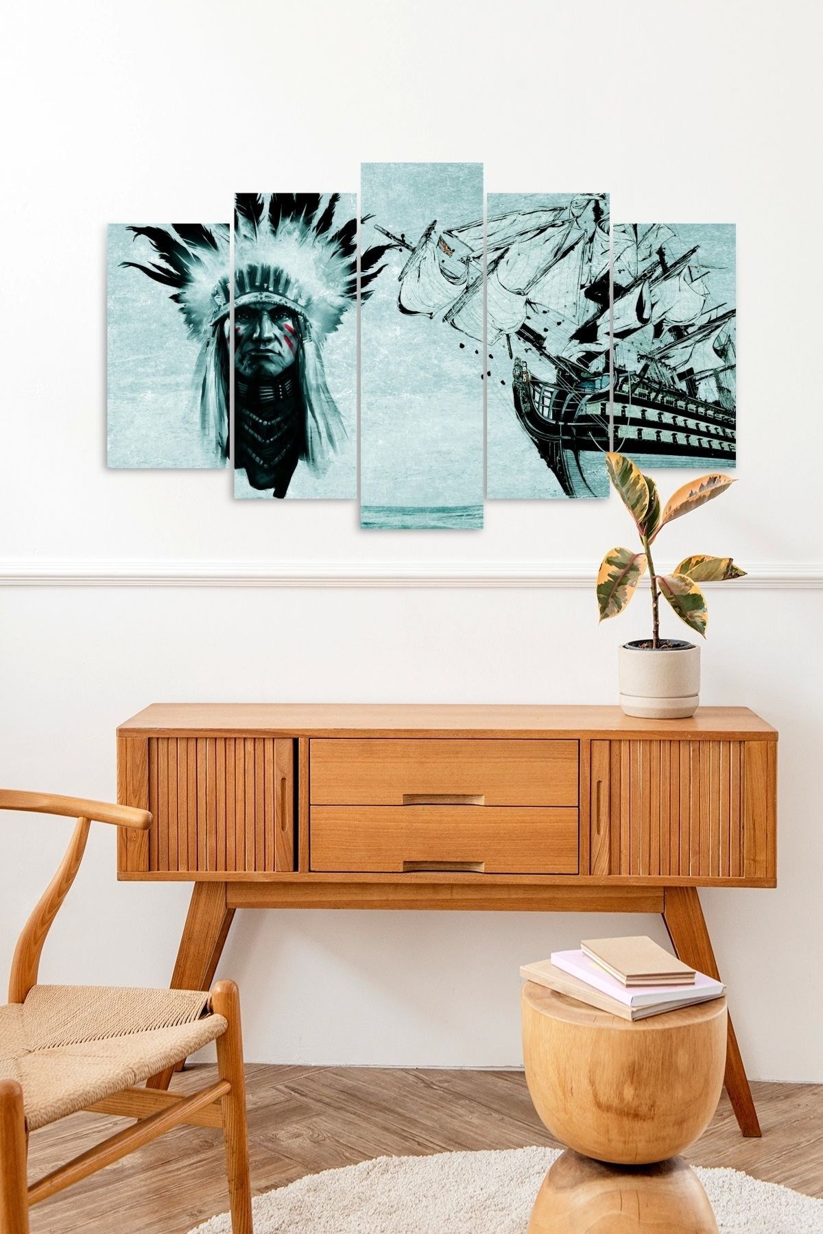 Modern tasarımıyla dikkat çeken Kızılderili gemi manzara tablosu, evinizin dekorasyonuna şık bir dokunuş katıyor; Dayanıklı ahşap malzemesi sayesinde uzun ömürlü kullanım sunar ve estetik görünümüyle mekanınıza değer katar; 5 parçadan oluşan set halinde gelen bu tablo, farklı boyutlardaki parçalarıyla duvarlarınızda uyumlu bir bütünlük oluşturmanızı sağlar; Kızılderili kültürünün özgün tasarımlarını modern çizgilerle buluşturan bu eser, yaşam alanlarınıza otantik bir hava katıyor;