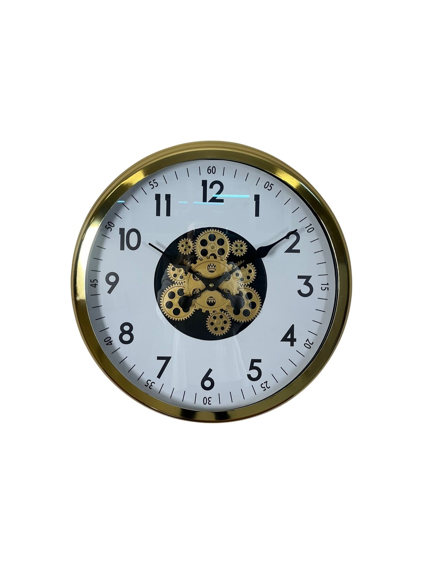 Parlak gold metal çerçevesi, beyaz kadranı ve merkezde yer alan altın tonlu hareketli çark mekanizması ile tasarlanan bu 60 cm duvar saati; bulunduğu ortama prestijli ve şık bir atmosfer kazandırır.