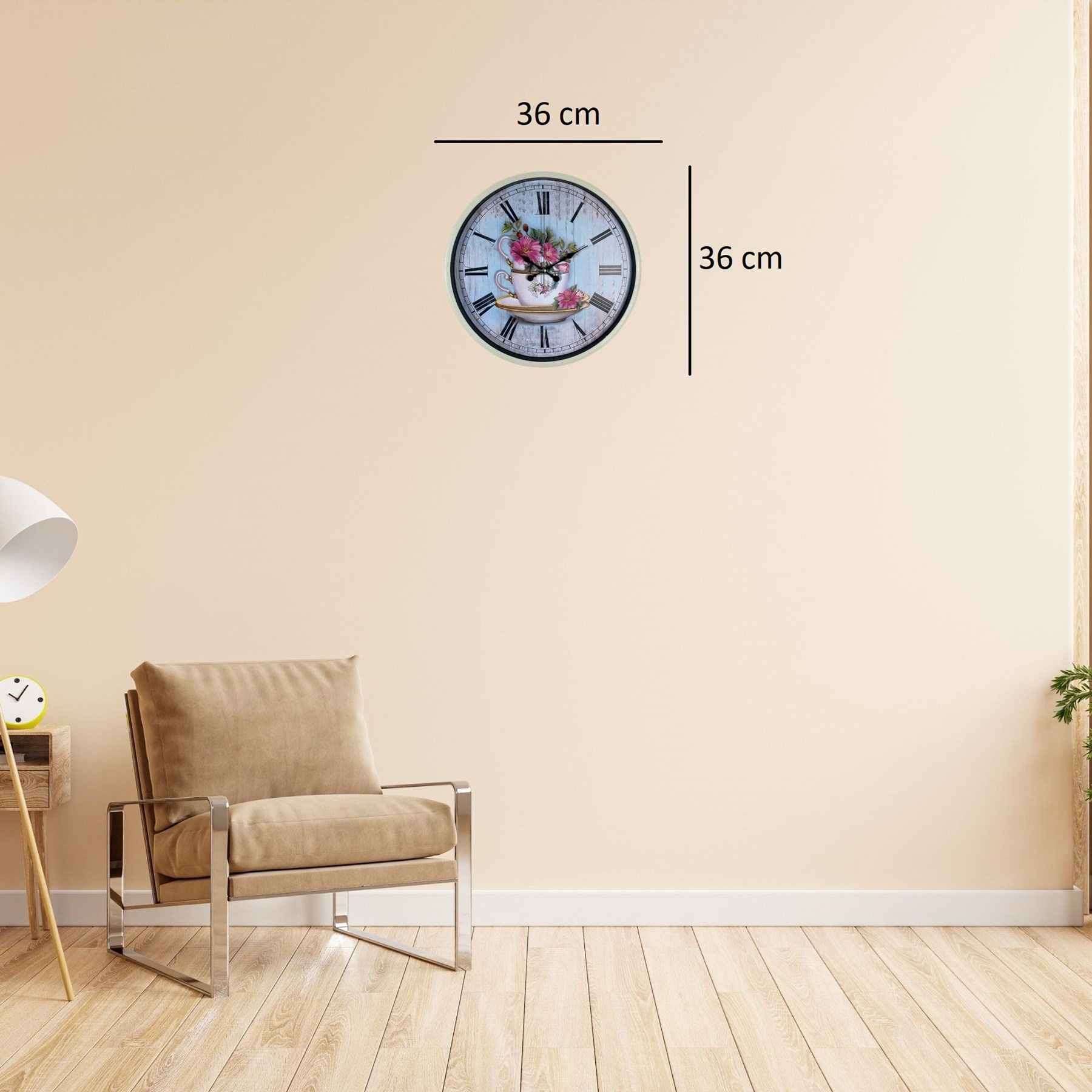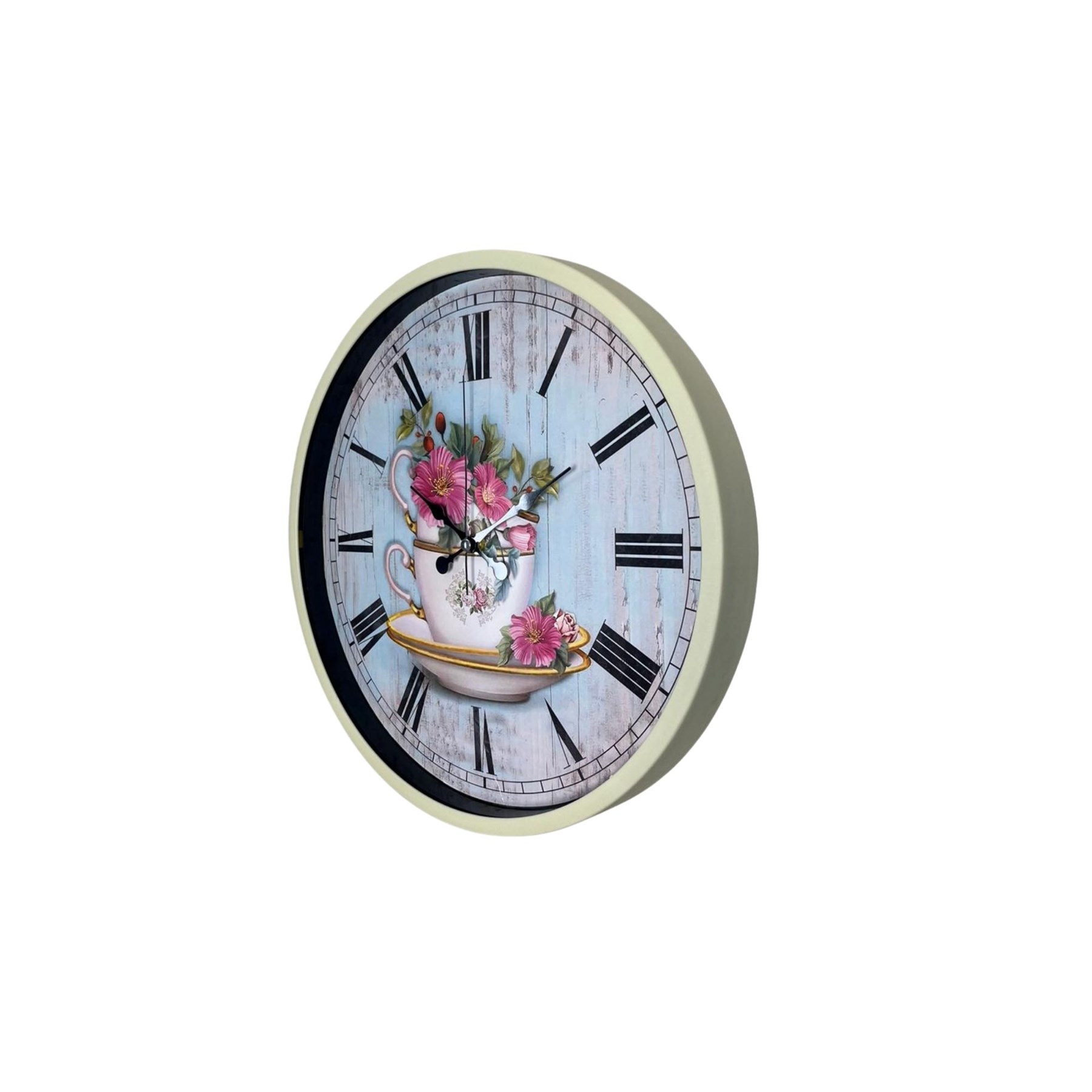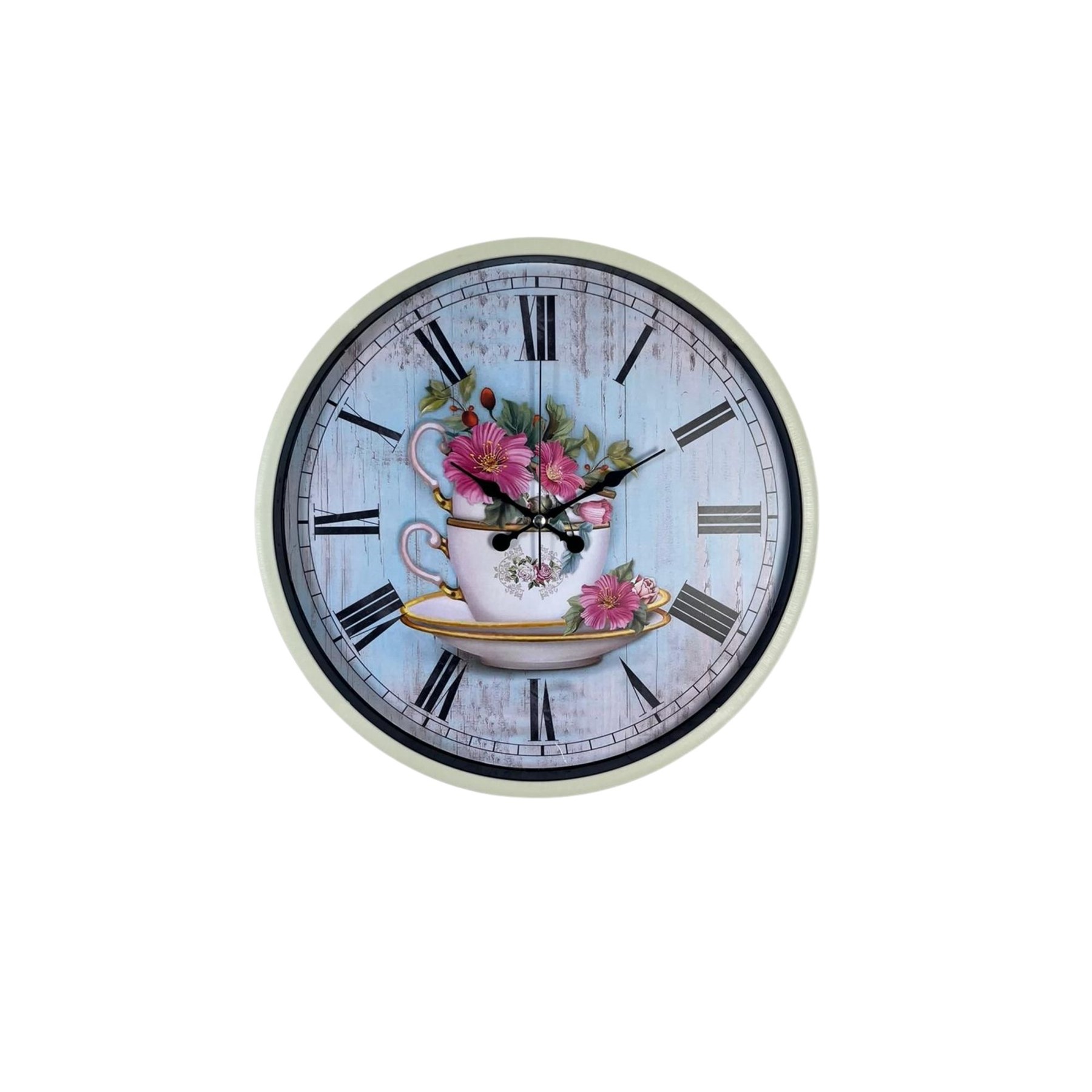 Zarif ve nostaljik tasarımıyla dikkat çeken 36 cm krem duvar saati, çiçekli fincan temalı dekoratif kadranı ile yaşam alanlarınıza sıcak ve estetik bir hava kazandırır. Vintage görünümlü arka planı ve klasik Roma rakamları sayesinde hem dekoratif hem de kolay okunabilir bir kullanım sunar.