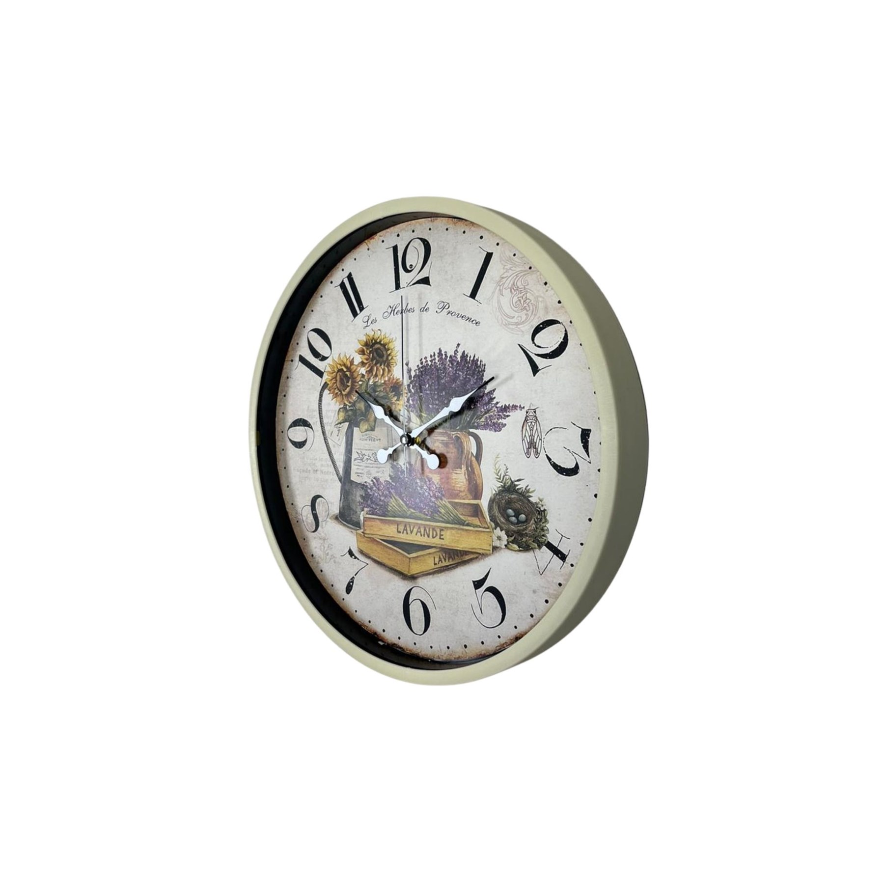 Zarif ve sıcak renk tonlarıyla tasarlanan 36 cm krem duvar saati, Provence esintili lavanta ve ayçiçeği desenli kadranı ile yaşam alanlarınıza nostaljik ve dekoratif bir atmosfer kazandırır. Vintage tarzı tasarımı sayesinde mutfak, salon, oturma odası, kafe ve restoran dekorasyonlarında şık bir tamamlayıcı olarak kullanılabilir.