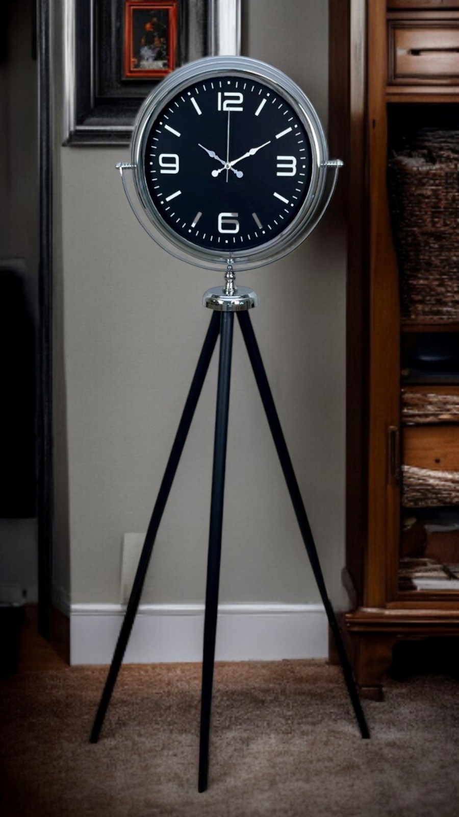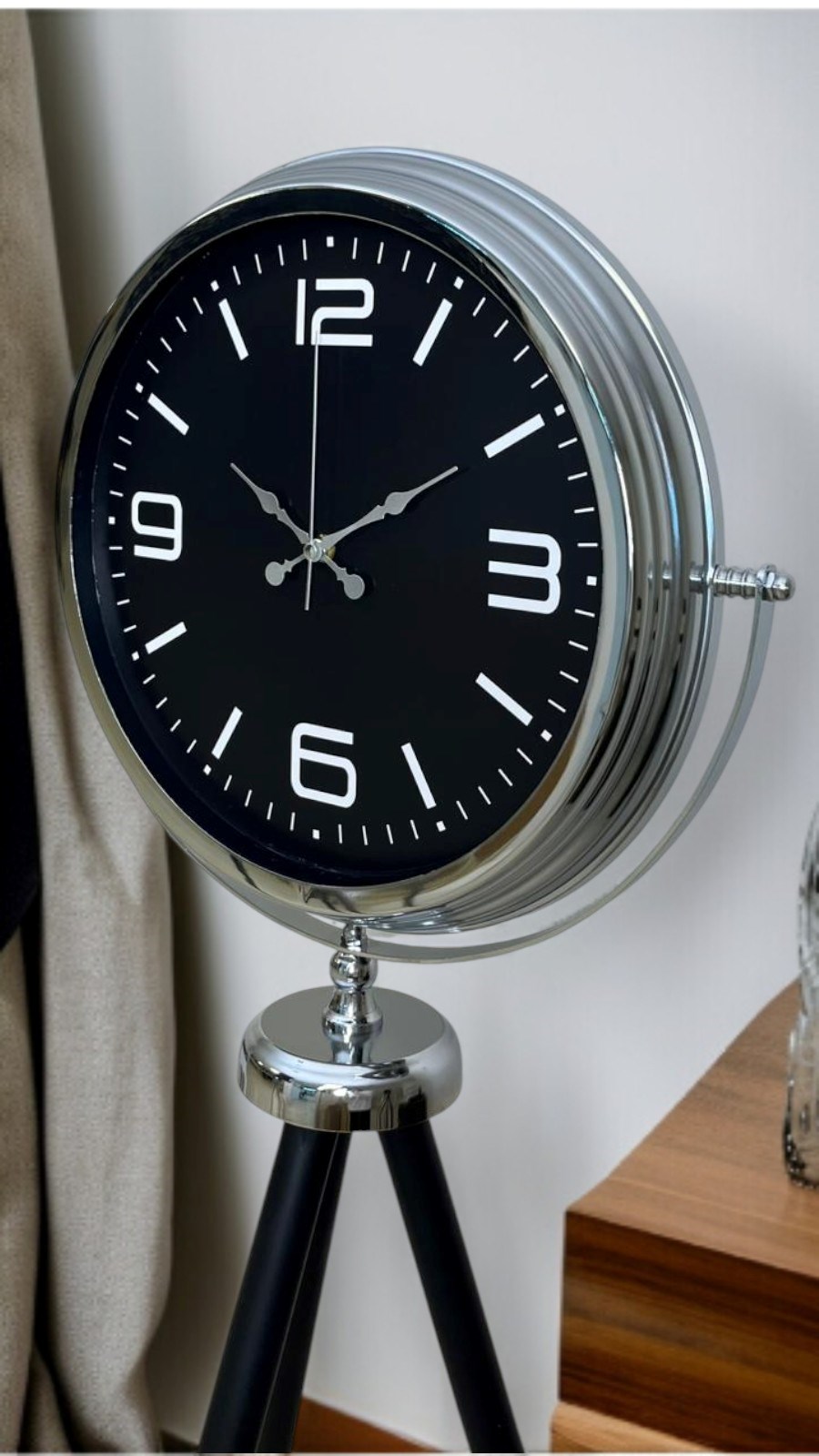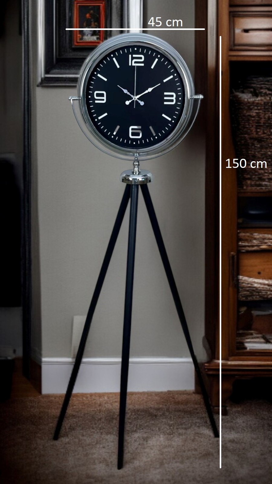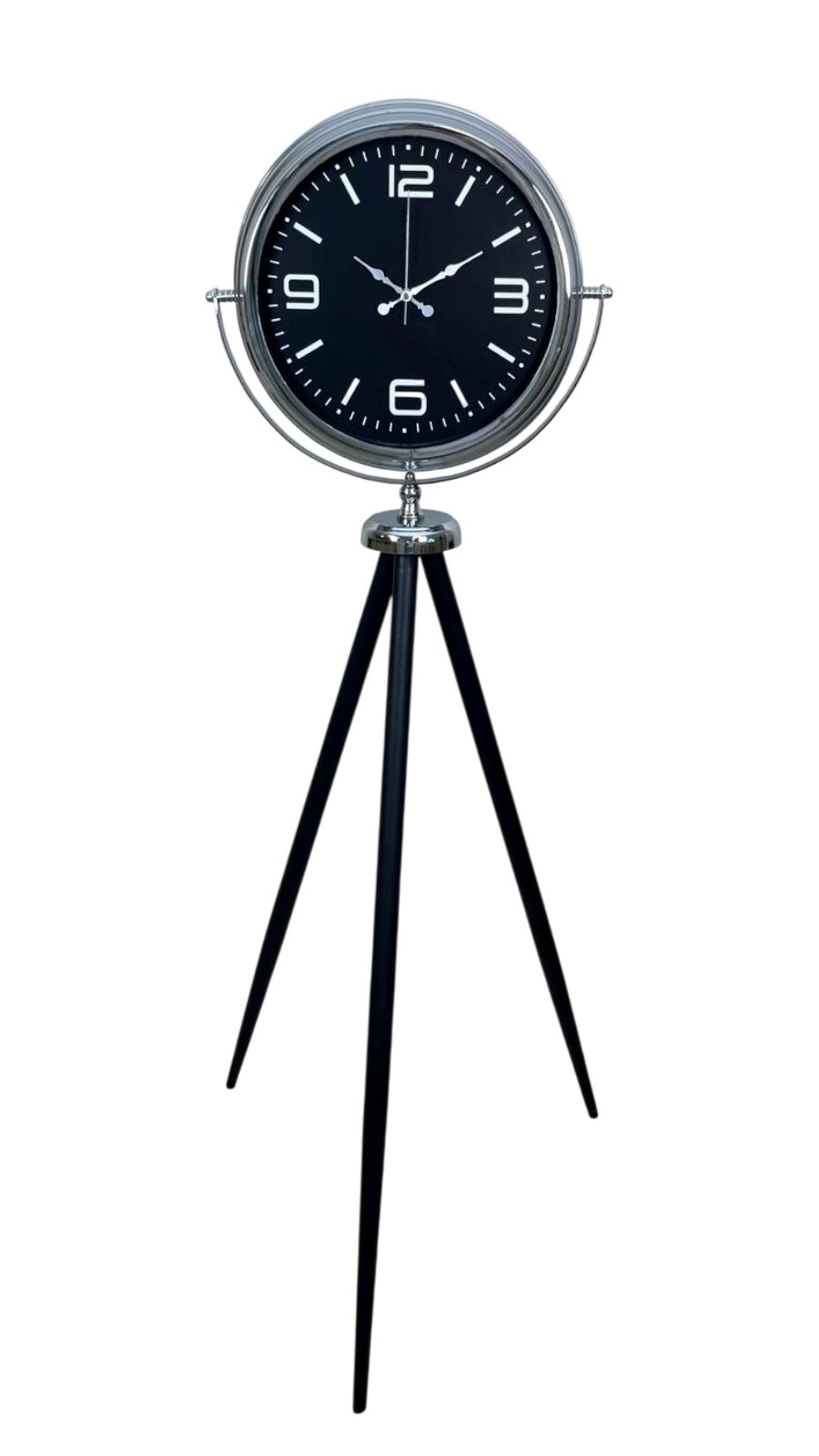 Modern çizgileri ve güçlü duruşuyla dikkat çeken bu krom tripod ayaklı saat, klasik saat anlayışının çok ötesinde, mekâna karakter kazandıran özel bir dekoratif üründür. 150 cm yüksekliği ve 45 cm genişliği sayesinde bulunduğu alanda yalnızca zamanı gösteren bir aksesuar değil, dekorasyonun merkezinde yer alan etkileyici bir tasarım objesi olarak öne çıkar.