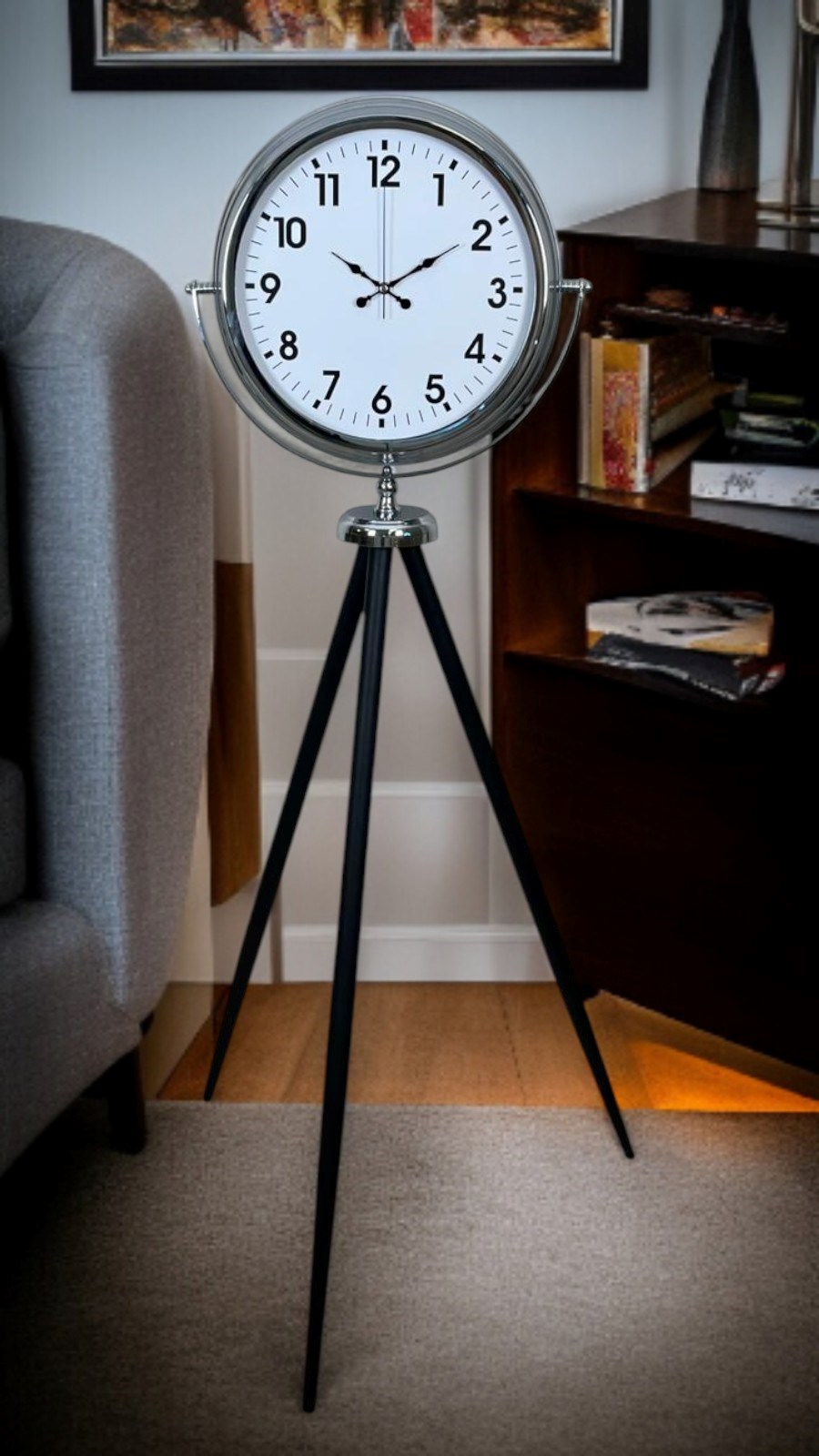 Modern çizgilerle zamansız tasarımı bir araya getiren bu krom tripod ayaklı saat, klasik saat anlayışının çok ötesinde, mekânlara güçlü bir karakter kazandırmak için tasarlanmıştır. 150 cm yüksekliği ve 45 cm genişliğiyle bulunduğu ortamda dikkat çeken bir odak noktası oluşturur. Sıradan duvar saatlerinden farklı olarak ayaklı yapısı sayesinde dekorasyonun bir parçası değil, başrolü olur.