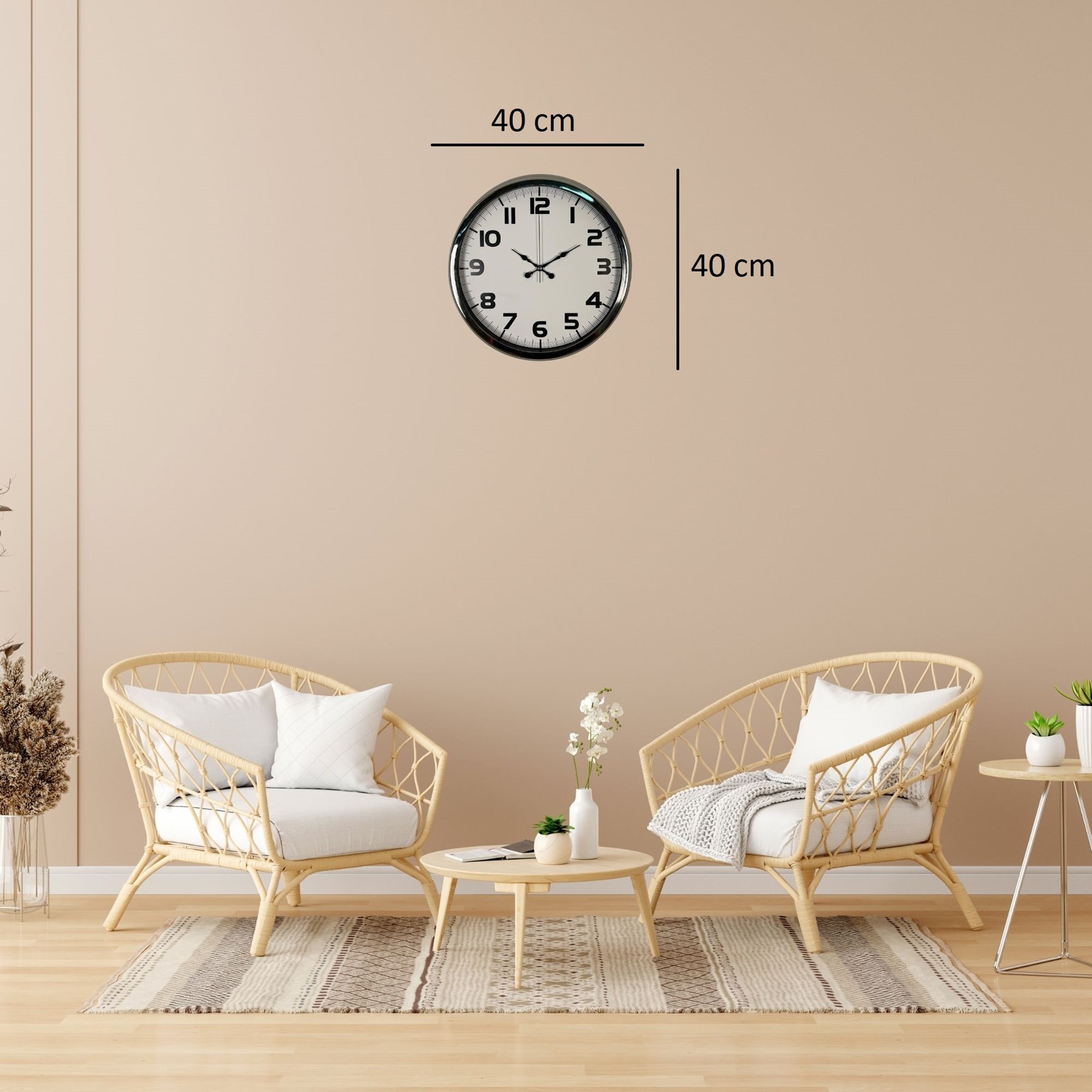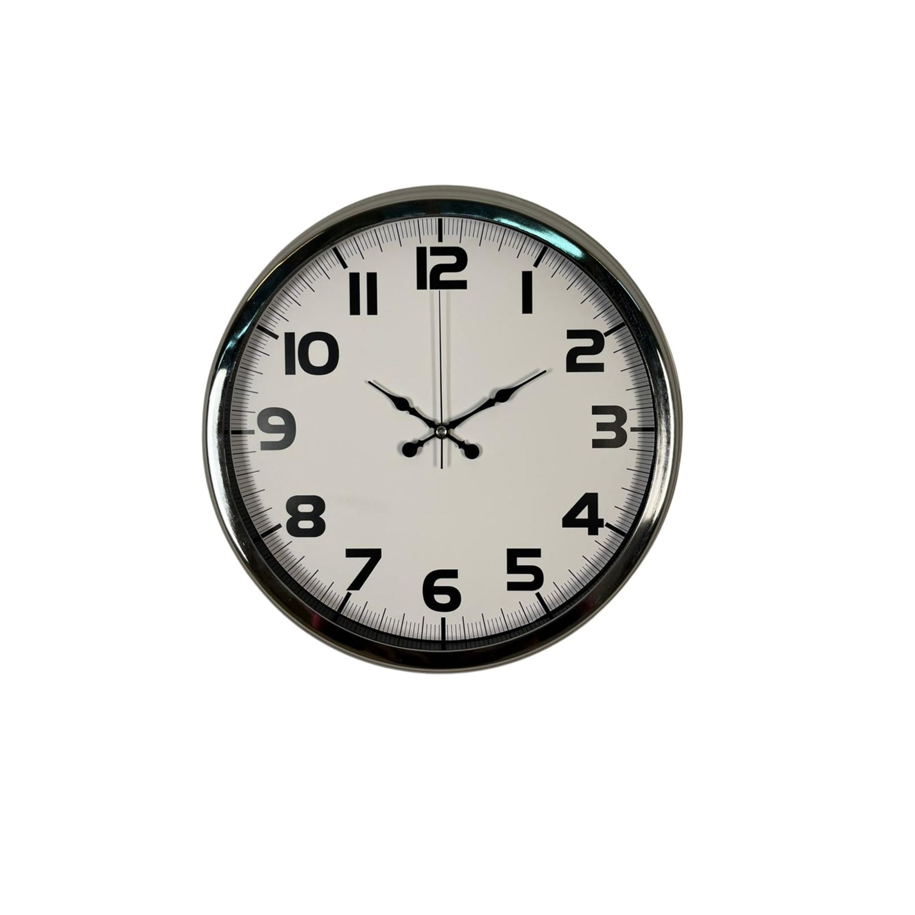 Modern ve şık tasarımıyla öne çıkan 40 cm krom metal duvar saati, yaşam alanlarınıza sade ama etkileyici bir görünüm kazandırır. Parlak krom metal kasası ve beyaz kadranı sayesinde hem modern hem klasik dekorasyonlara uyum sağlar. Büyük ve net rakam yapısı ile zamanı kolayca okunabilir hale getirir.