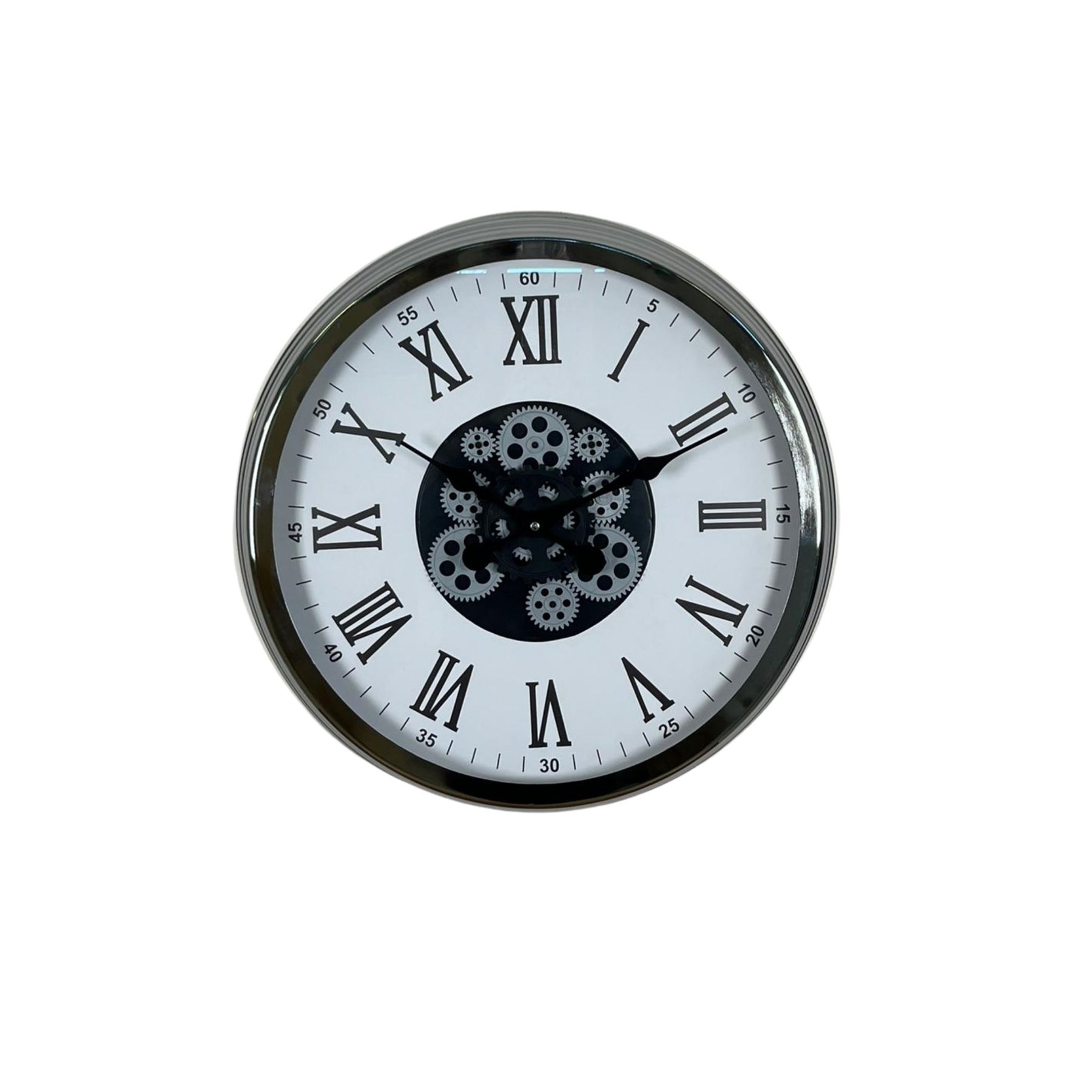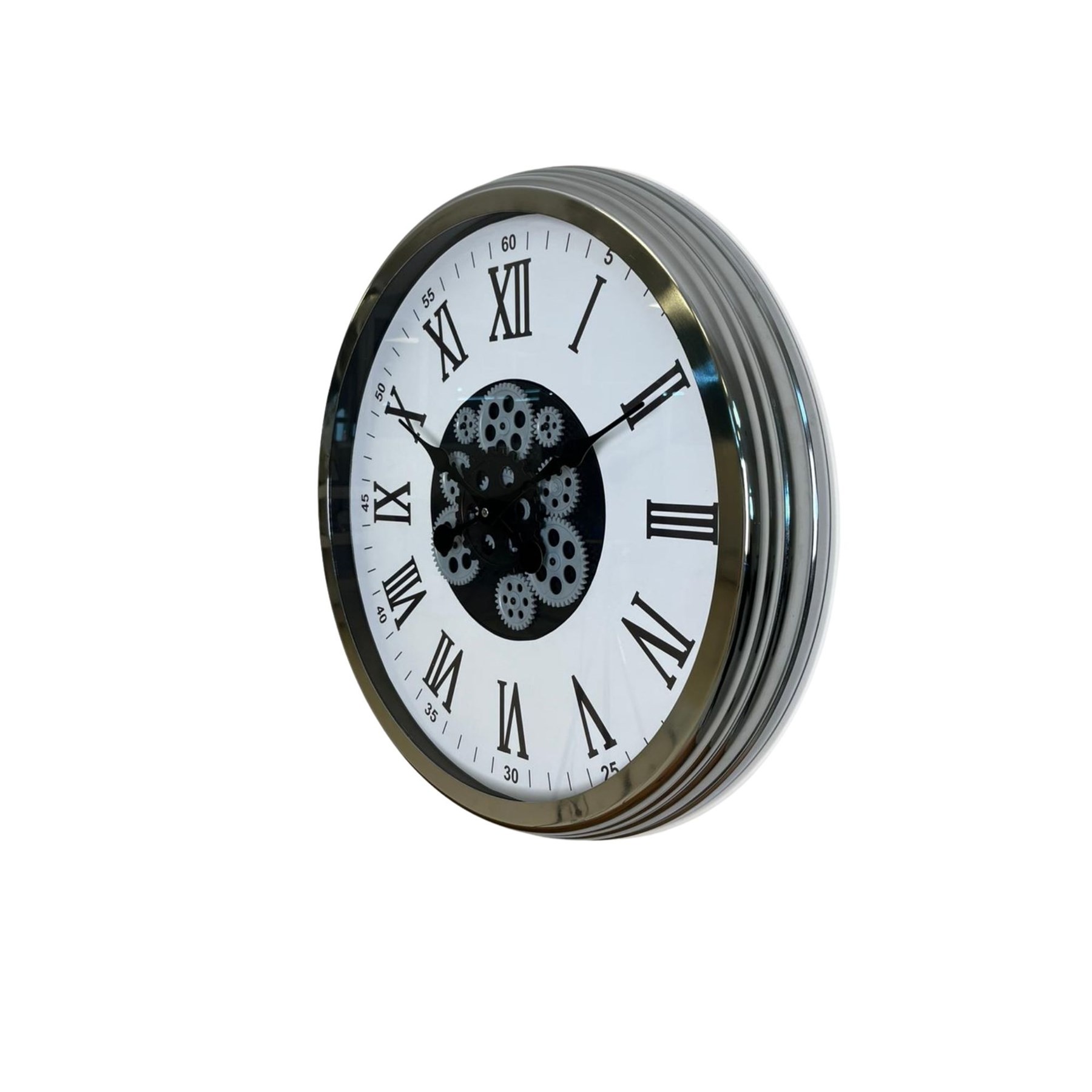 Parlak krom kasa ışığı yansıtarak mekâna modern bir hava katarken, merkezde yer alan hareketli çark sistemi saate mekanik ve dinamik bir karakter kazandırır. Büyük Roma rakamları sayesinde uzaktan rahat okunabilir ve dekoratif etkisi oldukça yüksektir.