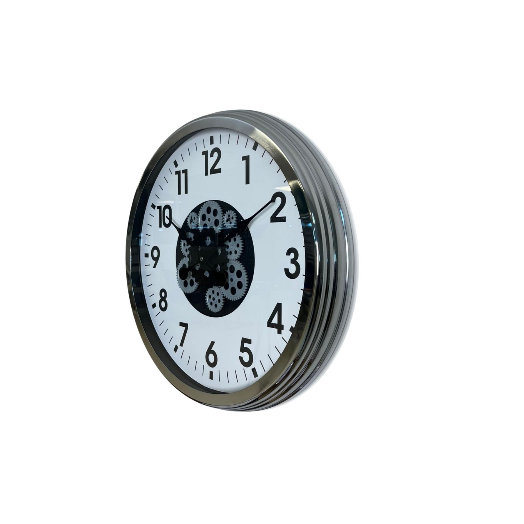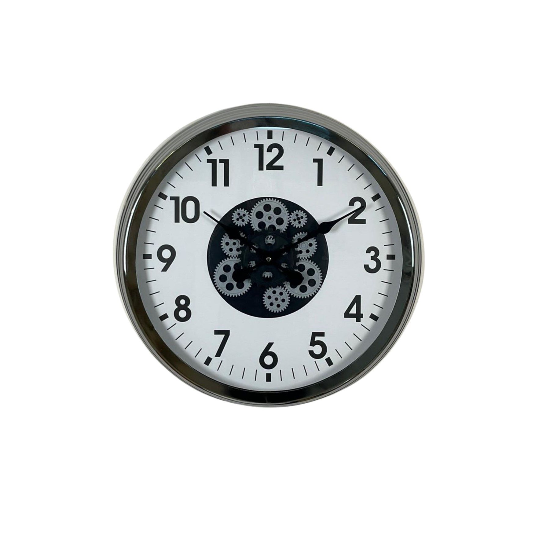 Modern krom çerçevesi, beyaz zemin üzerindeki net siyah rakamları ve hareketli çark tasarımı ile bu 60 cm Çarklı Duvar Saati; hem şık hem güçlü bir dekoratif tamamlayıcıdır.