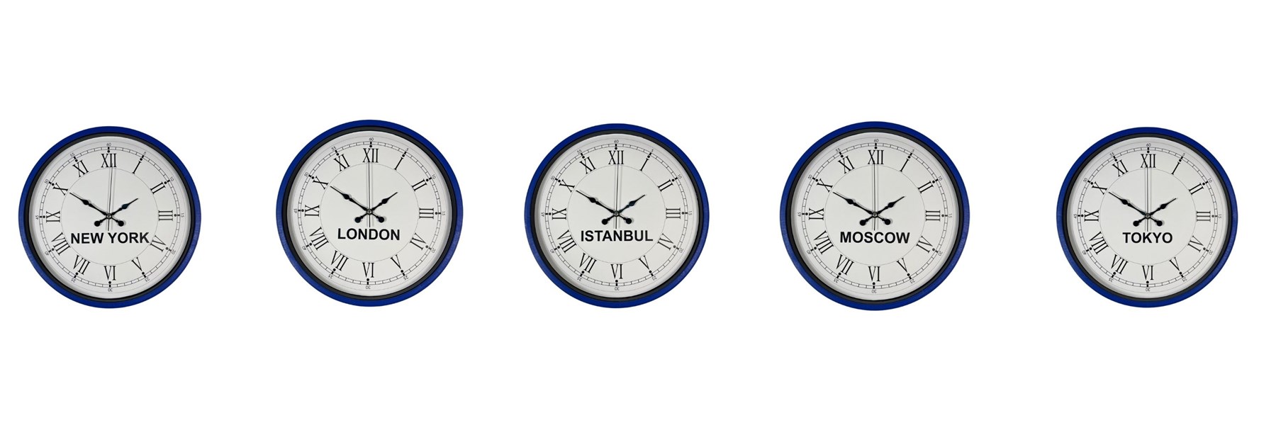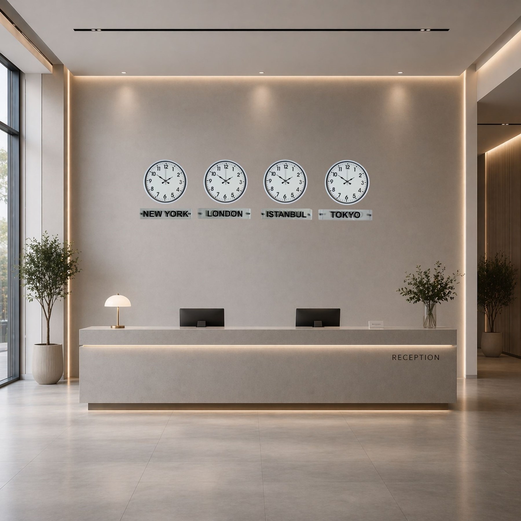 New York, London, Istanbul, Moscow ve Tokyo şehirlerinin saatlerini aynı anda takip etmenizi sağlayan bu özel set; oteller, resepsiyon alanları, ofisler ve uluslararası çalışan işletmeler için hem dekoratif hem de fonksiyonel bir çözümdür.