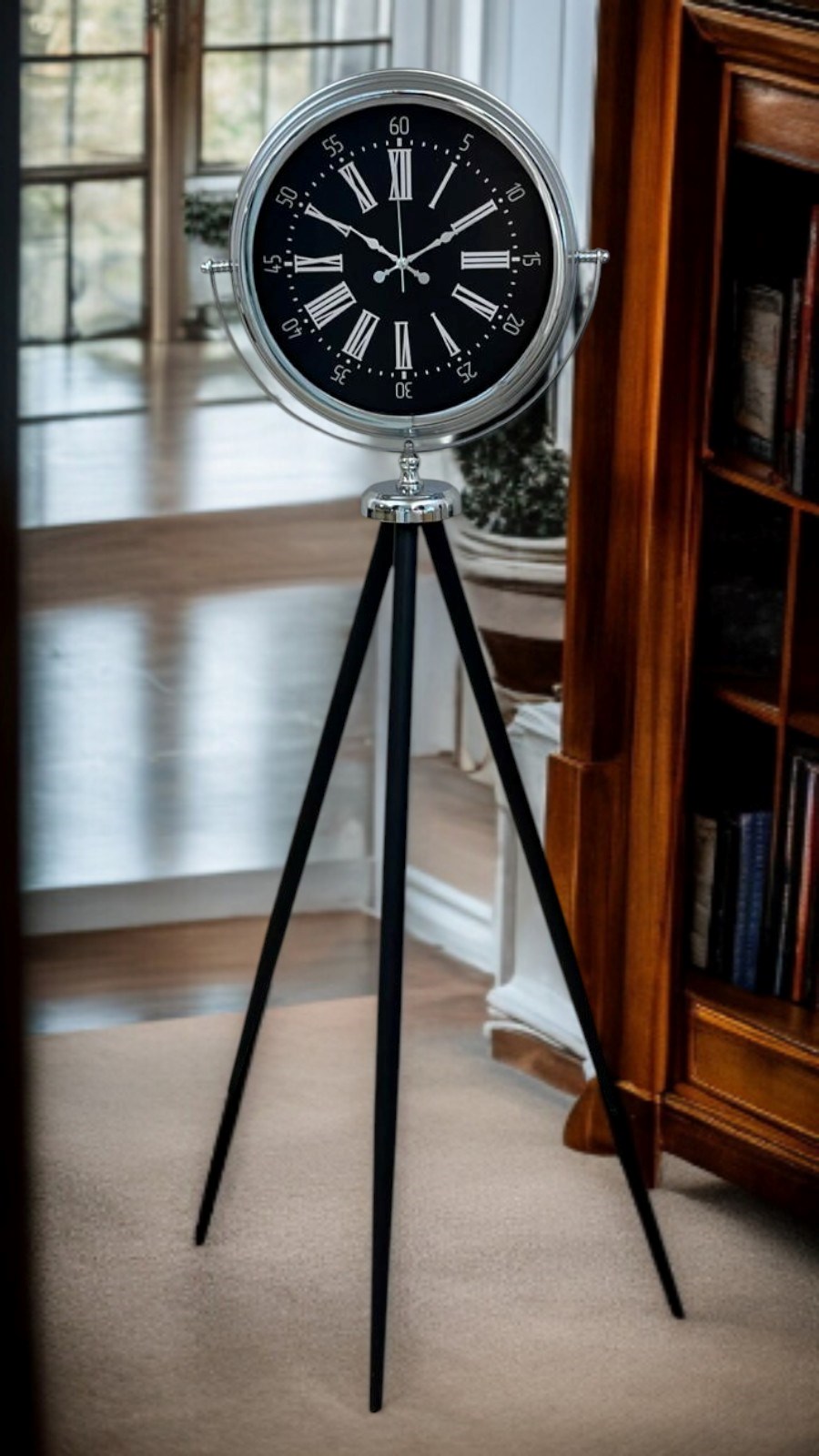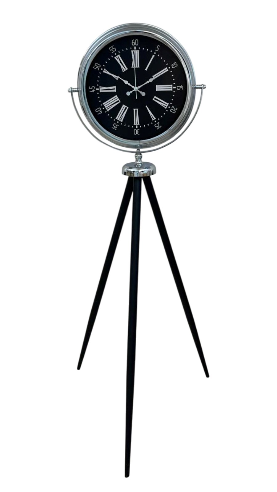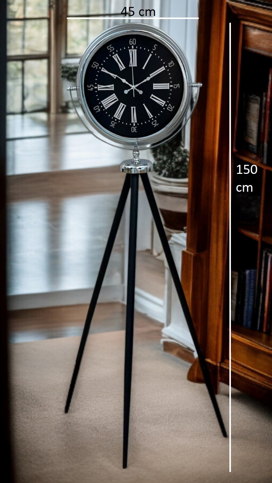 Mekânlara güçlü bir karakter ve zamansız bir şıklık kazandıran bu krom tripod ayaklı saat, Roma rakamlı siyah kadranı ile klasik saat estetiğini modern çizgilerle buluşturur. 150 cm yüksekliği sayesinde bulunduğu ortamda dikkat çeken bir odak noktası haline gelir; yalnızca bir saat değil, aynı zamanda prestijli bir dekor objesi olarak öne çıkar.