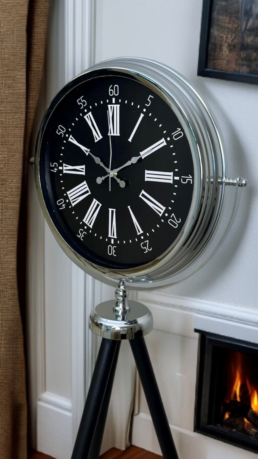 Tripod ayak tasarımı, saate modern ve dengeli bir duruş kazandırırken siyah ayaklar sayesinde dekorasyona güçlü bir kontrast ekler. Salon, ofis, villa, otel lobisi, mağaza ve showroom gibi alanlarda rahatlıkla kullanılabilir. Klasik, modern-klasik ve endüstriyel dekorasyon stilleriyle uyum sağlar.