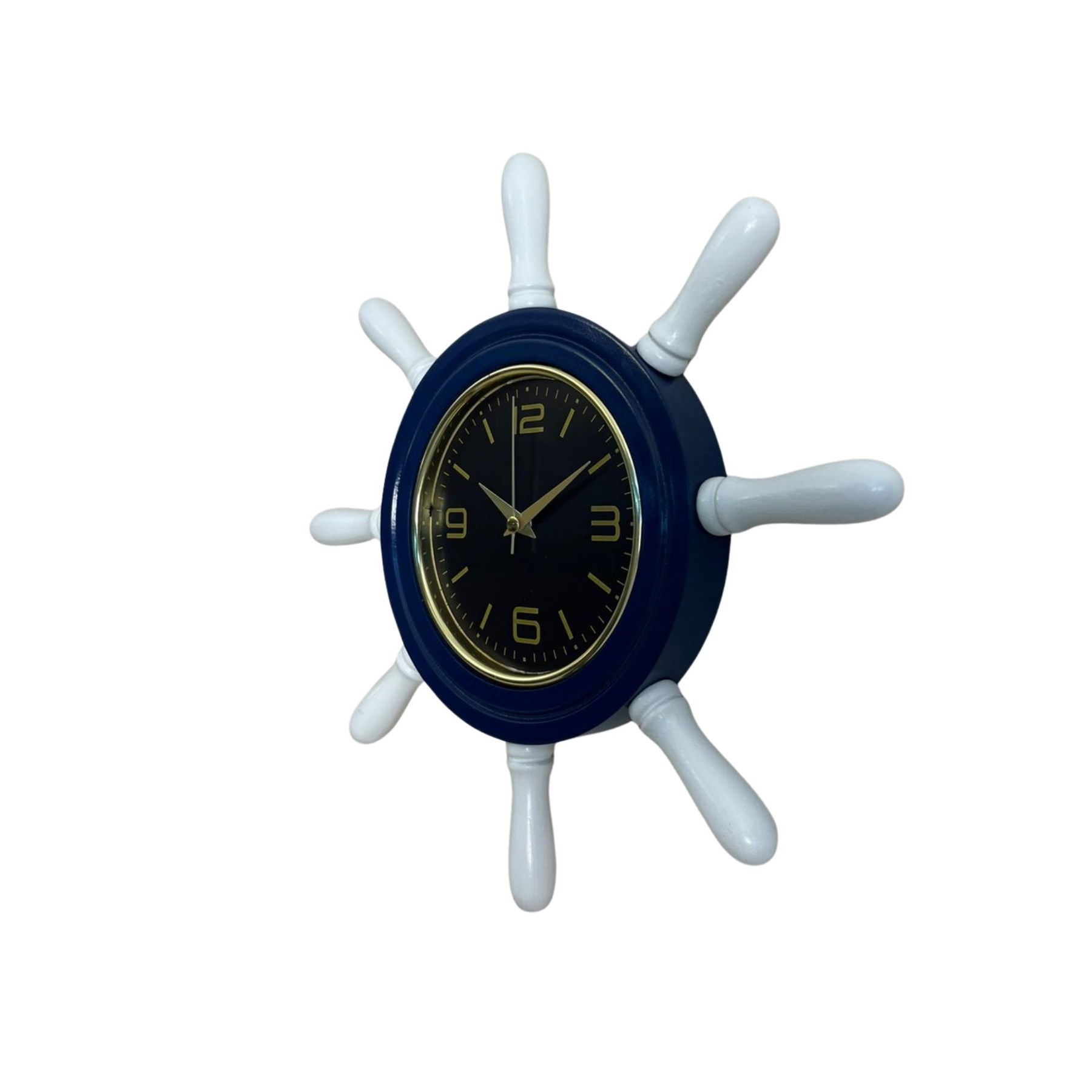 Denizcilik temalı dekorasyonu yaşam alanlarınıza taşıyan Lacivert Kavelalı Dümen Duvar Saati, klasik gemi dümeni tasarımından ilham alınarak üretilmiş şık ve dikkat çekici bir dekoratif duvar saatidir. Marin tarzını sevenler için tasarlanan bu model, lacivert gövdesi ve beyaz kavelaları ile bulunduğu ortama deniz esintisi katan estetik bir görünüm sunar.