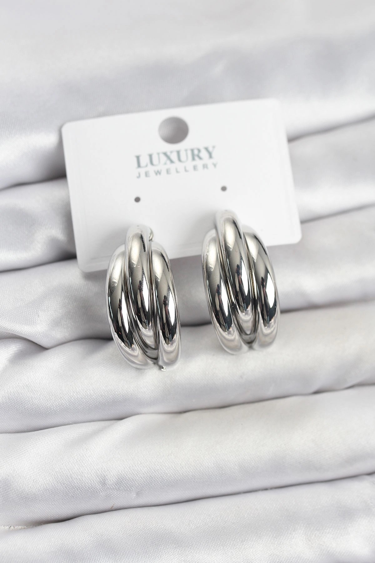 Mey İthalat® 316L Çelik Gümüş Renk Zirkon Taşlı Yonca Model İşleme Detay Kadın Küpe