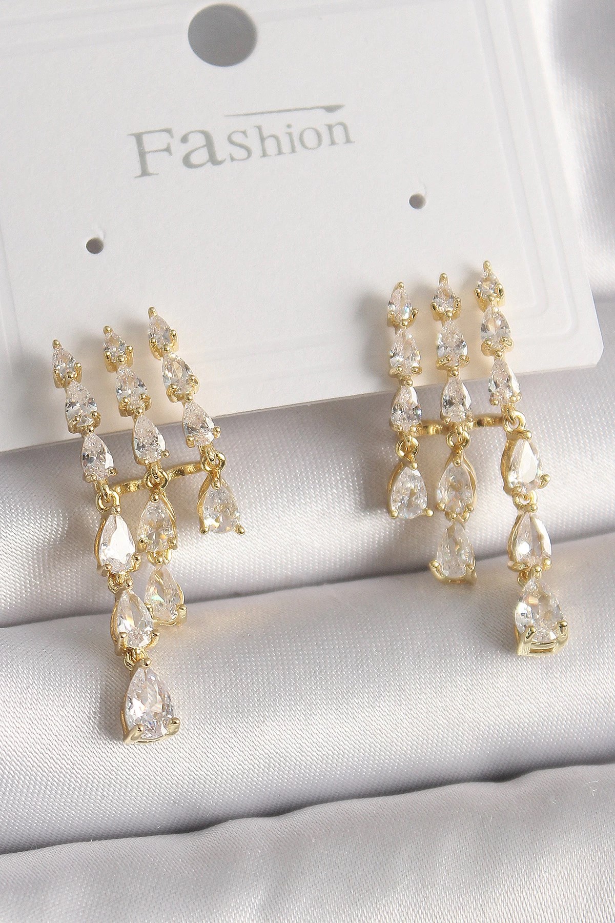Mey İthalat® Gold Renk Zirkon Taşlı Üçgen Model Kadın Küpe