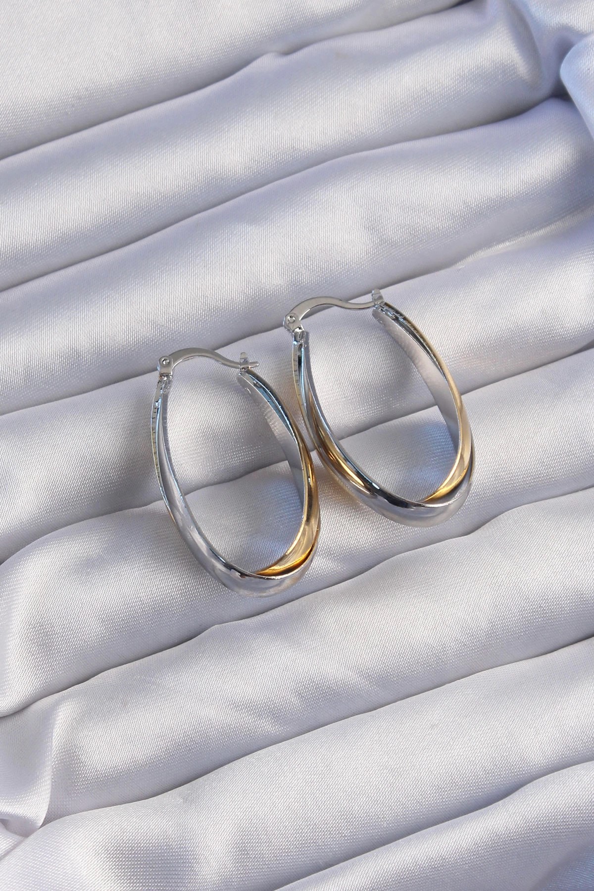Mey İthalat® Pirinç Gold Gümüş Renkli Uzun Kıvrımlı Küpe