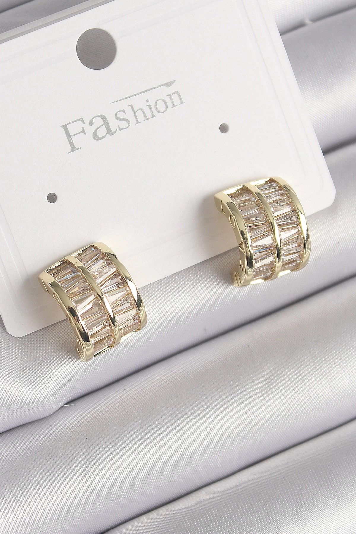 Mey İthalat® Pirinç Gold Renk Zirkon Taşlı Kıvrım Detay Sallantılı Küpe
