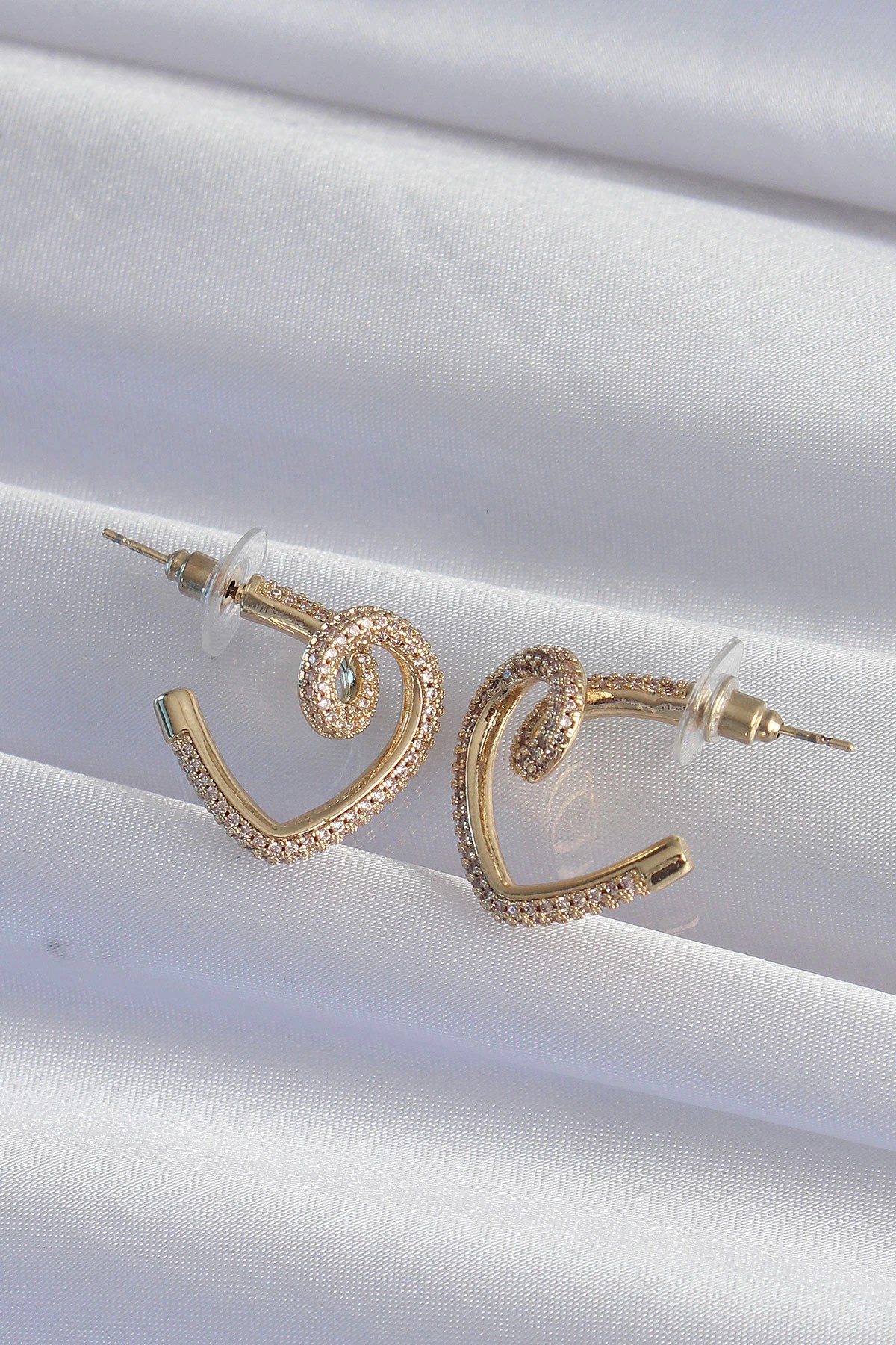 Mey İthalat® Pirinç Gold Renk Zirkon Taşlı Kıvrımlı Yarım Kalp Küpe