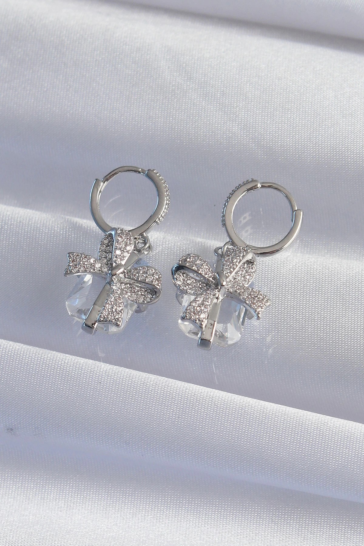 Mey İthalat® Pirinç Gümüş Renk İri Zirkon Taşlı Fiyonk Model Halka Küpe