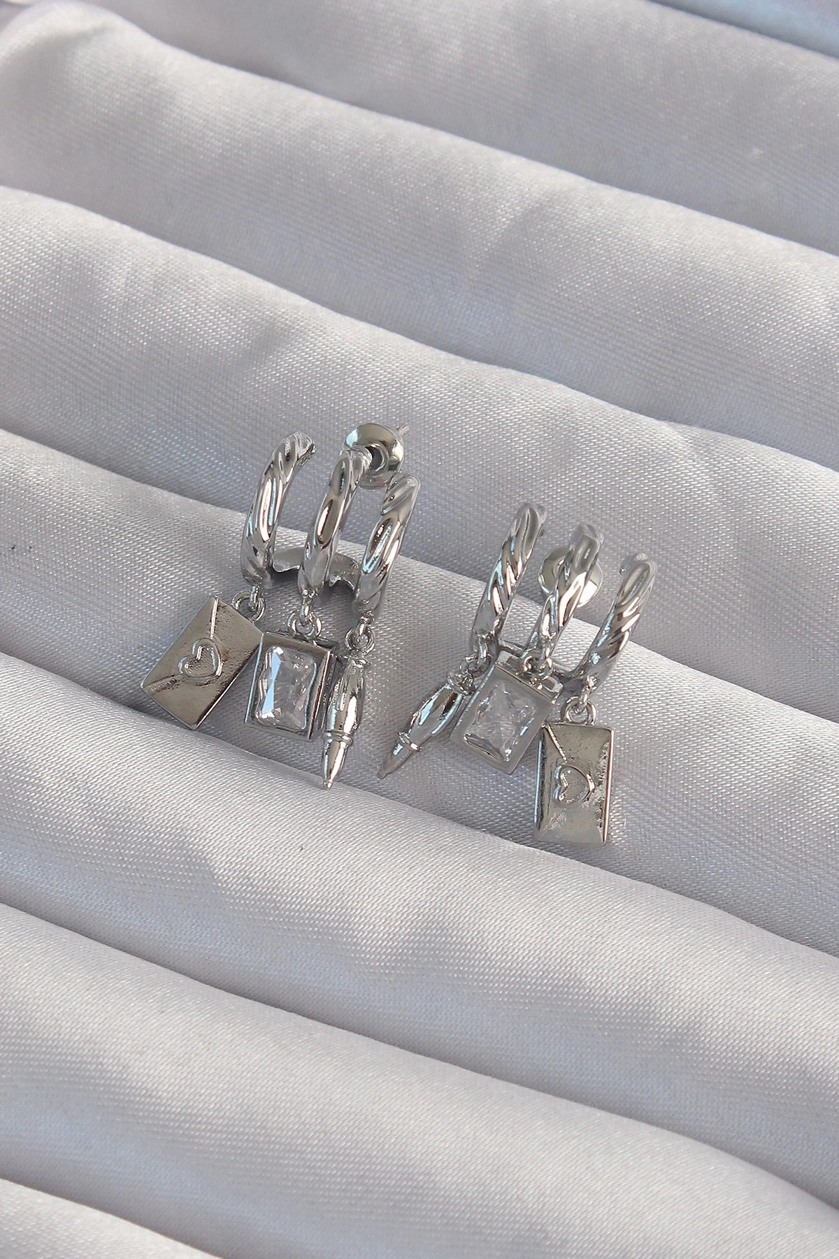 Mey İthalat® Pirinç Gümüş Renk Kalp İşlemeli Daire Plaka Model Kadın Küpe