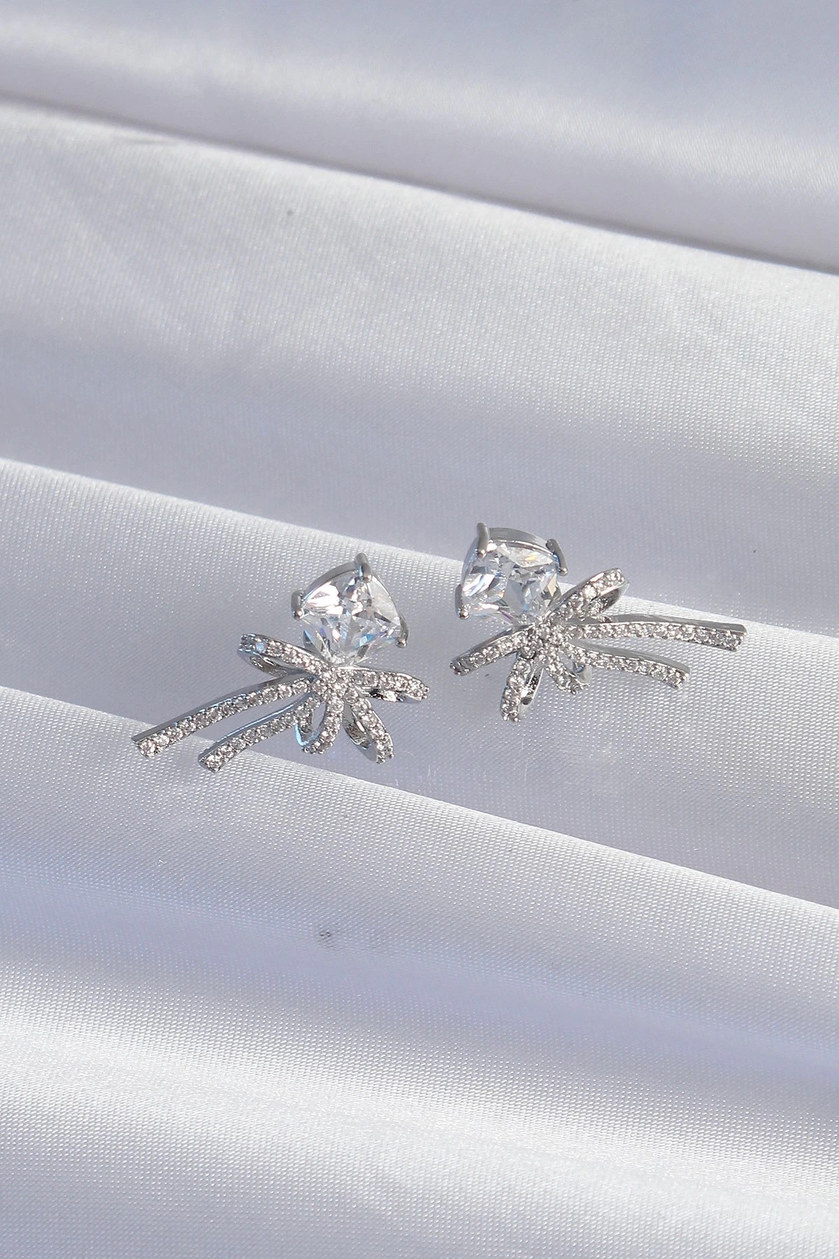 Mey İthalat® Pirinç Gümüş Renk Kare Zirkon Taşlı Fiyonk Küpe