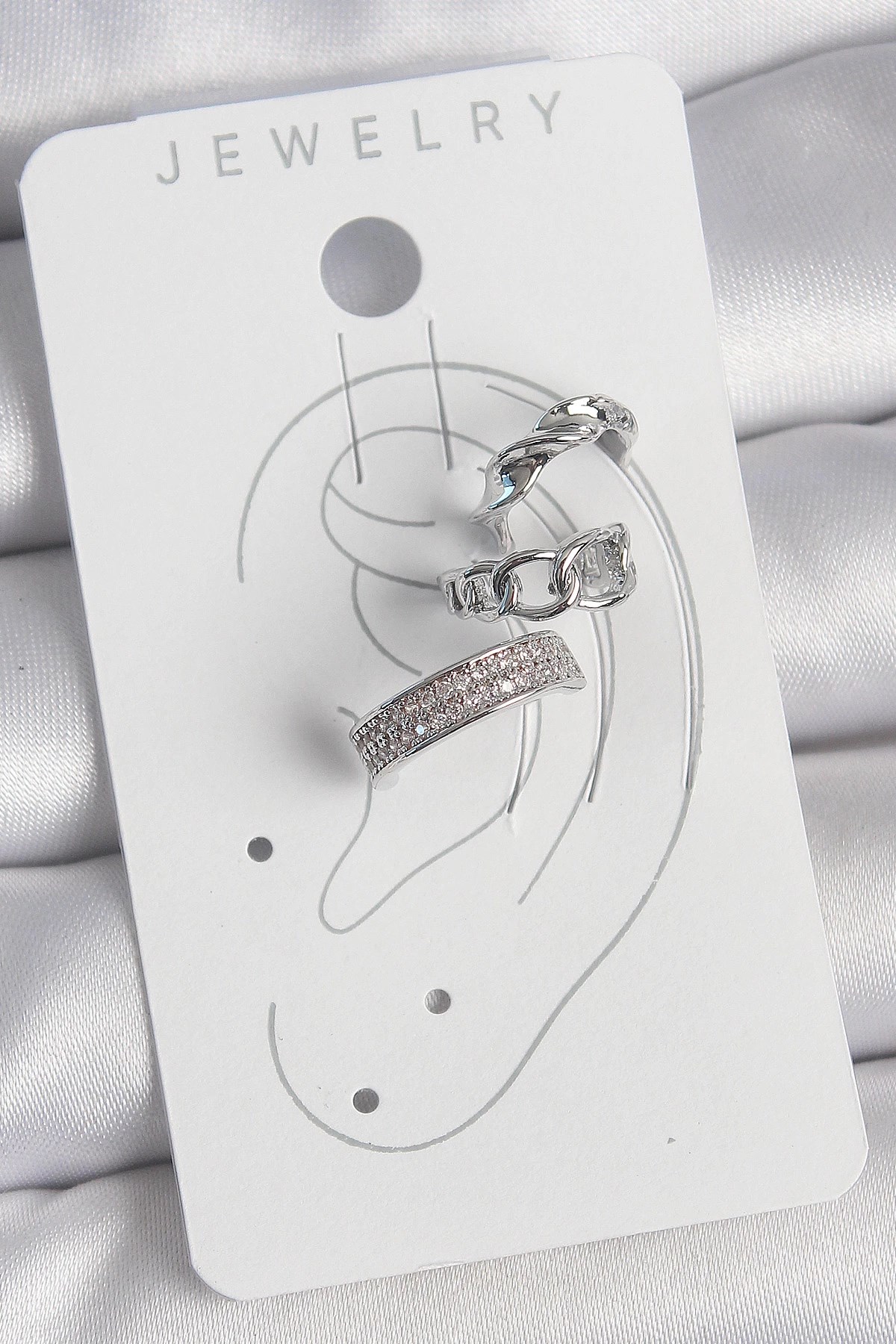 Mey İthalat® Pirinç Gümüş Renk Zirkon Taşlı 3'Lü Zincir Sarmal Model Kadın Kıkırdak Küpe