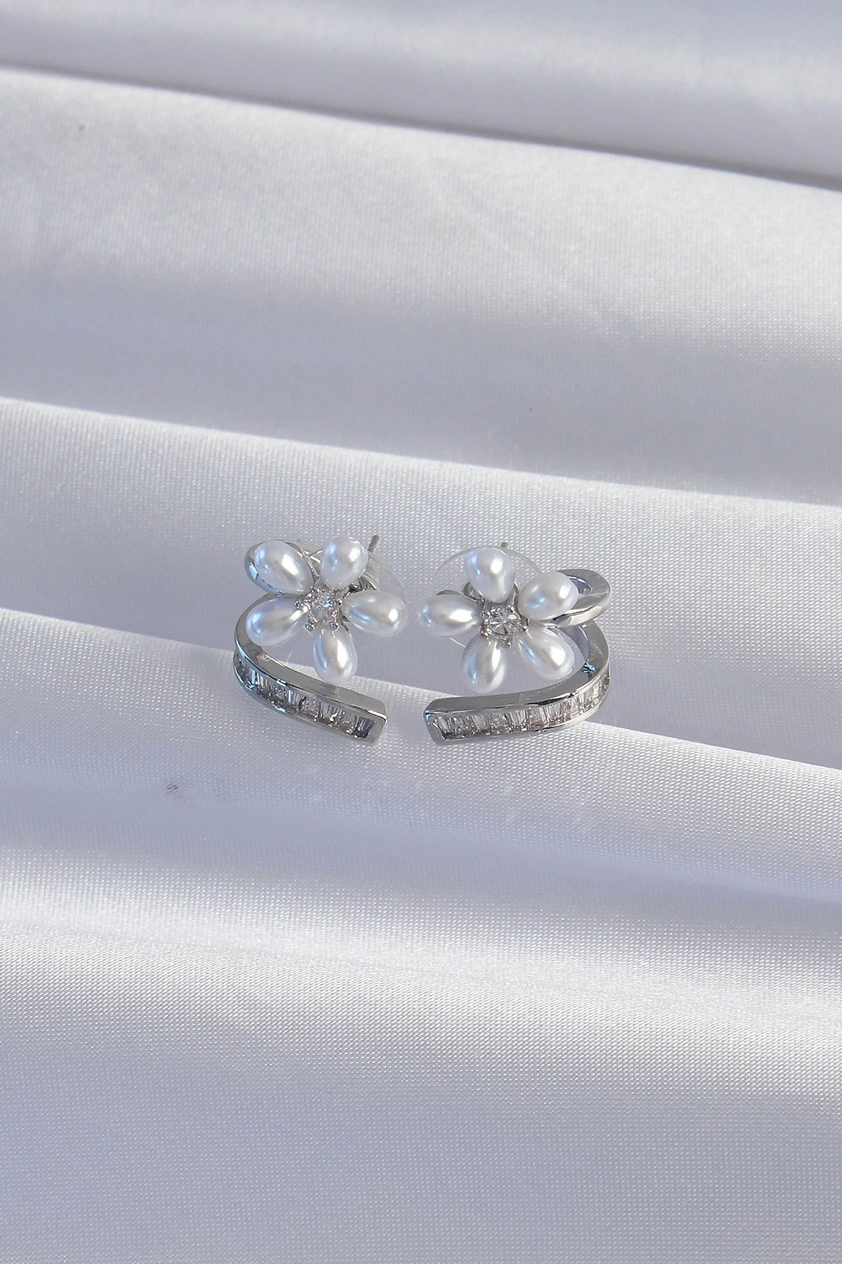 Mey İthalat® Pirinç Gümüş Renk Zirkon Taşlı Kıvrımlı İnci Çiçek Küpe