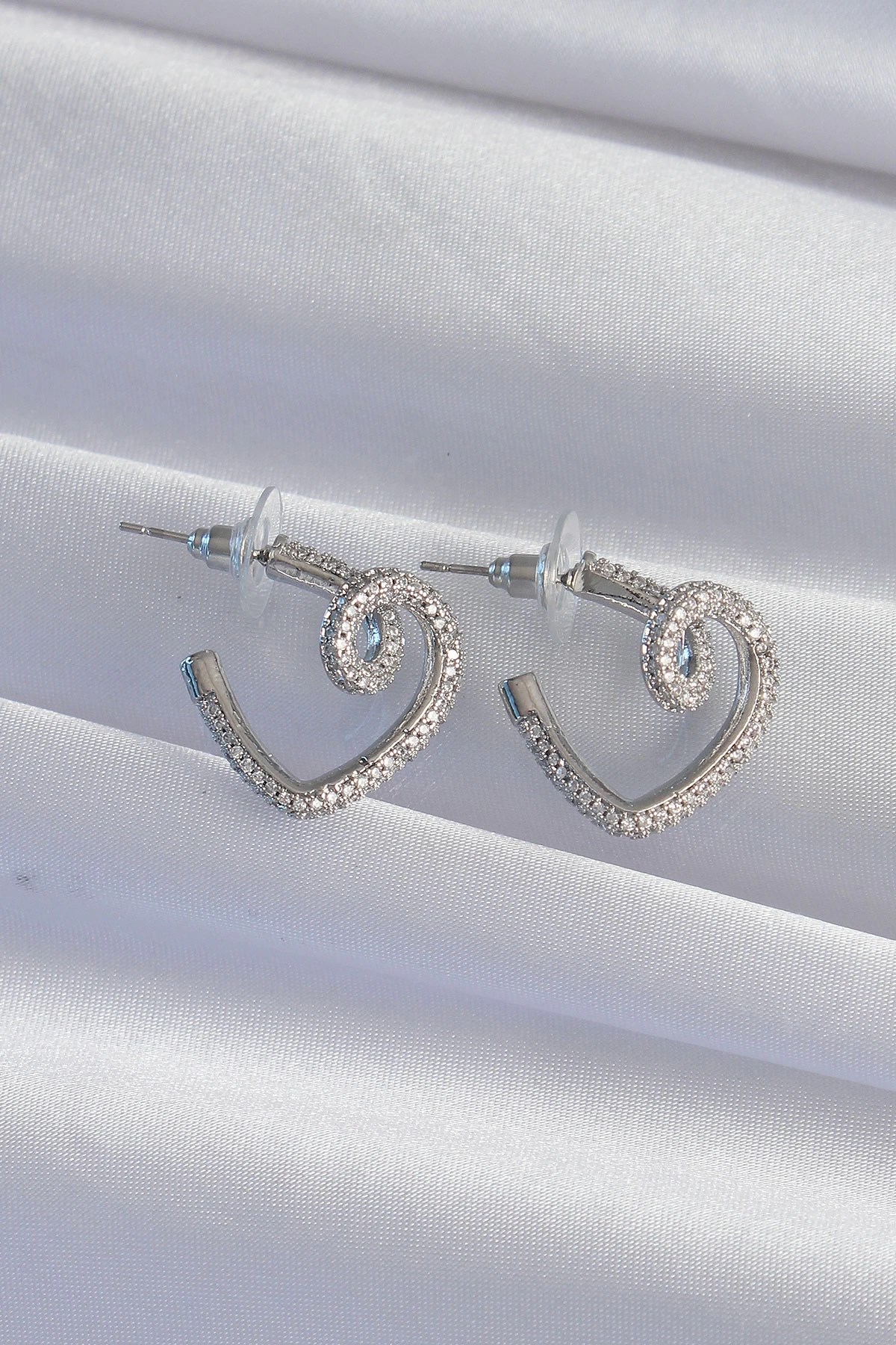Mey İthalat® Pirinç Gümüş Renk Zirkon Taşlı Kıvrımlı Yarım Kalp Küpe