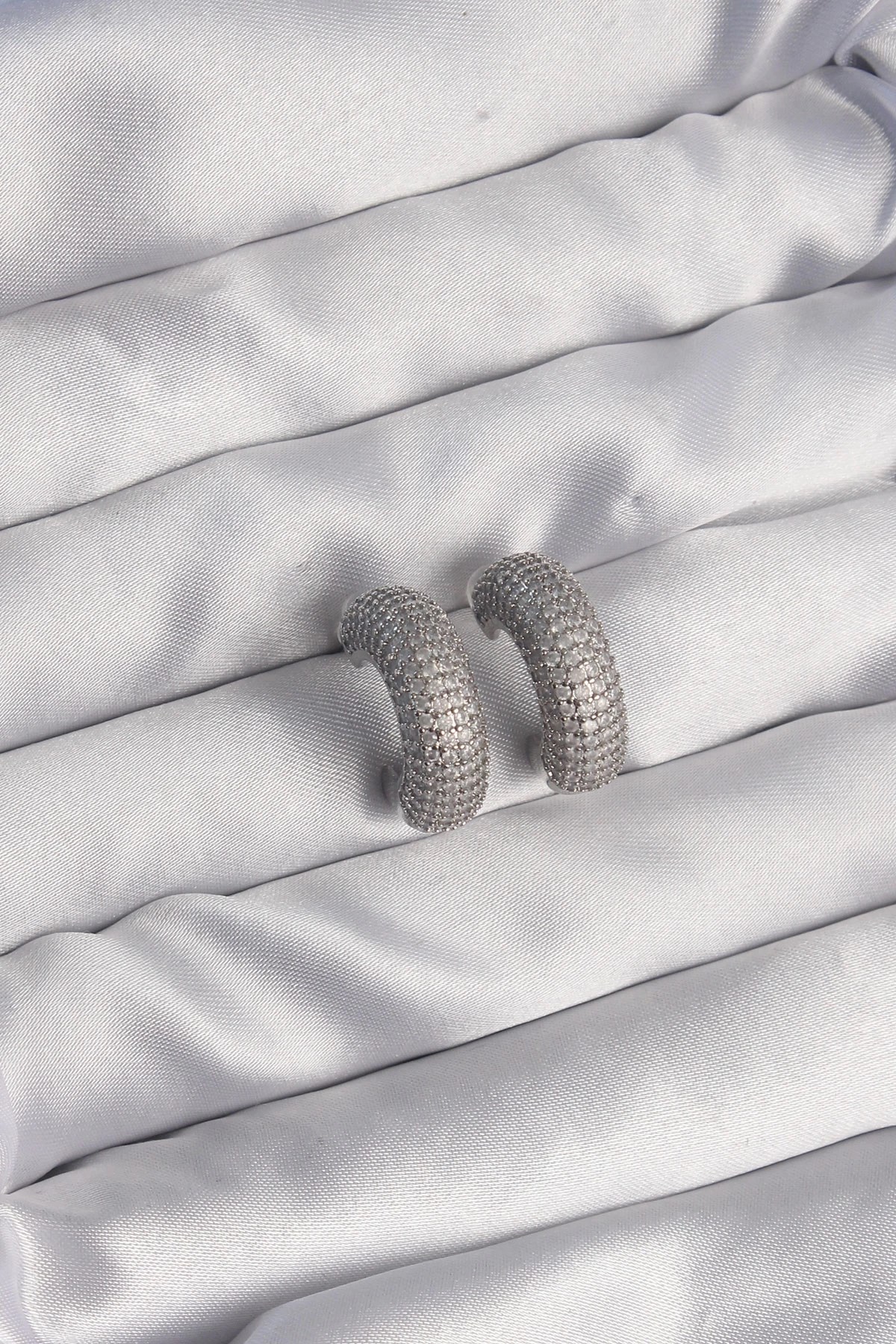 Mey İthalat® Pirinç Gümüş Renk Zirkon Taşlı Yarım Halka Küpe