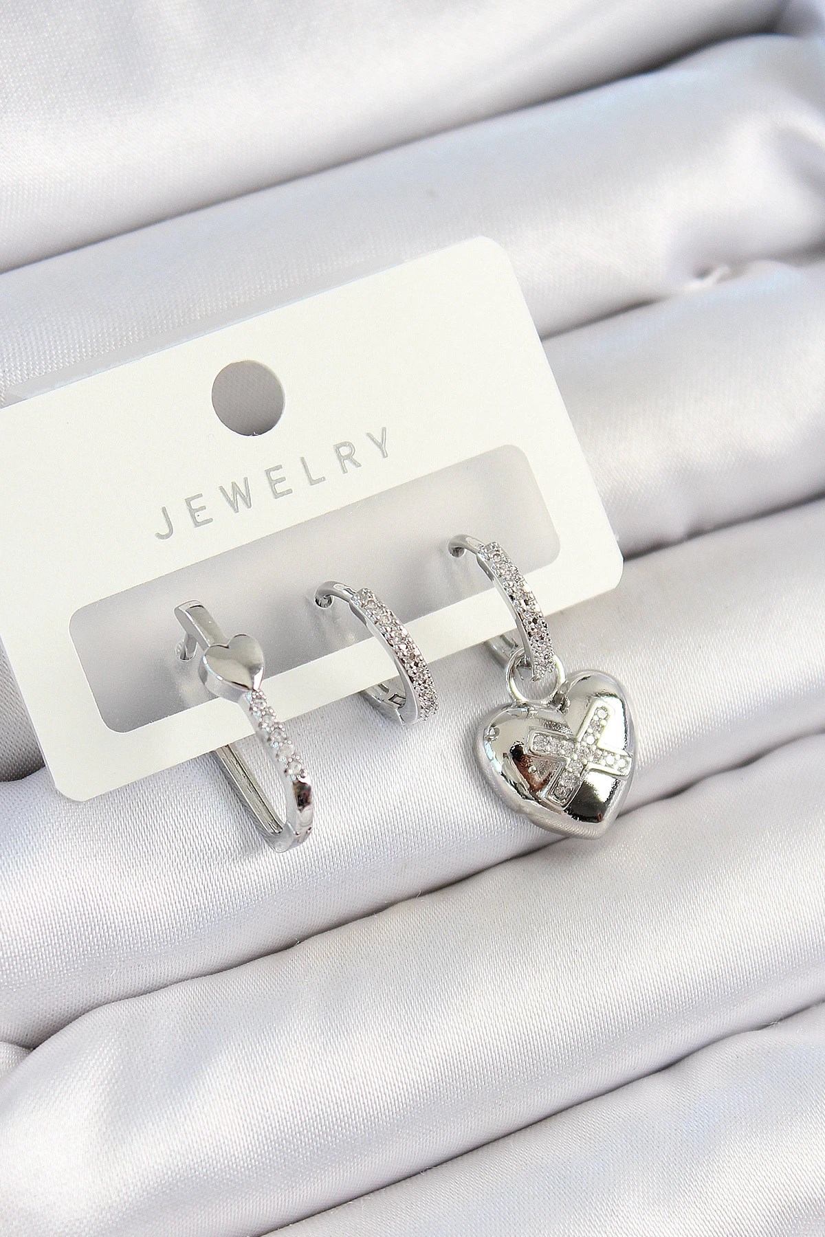 Mey İthalat® Pirinç Ok Figürlü Zirkon Taşlı Gümüş Renk 3'lü Kıkırdak Kadın Küpe Set