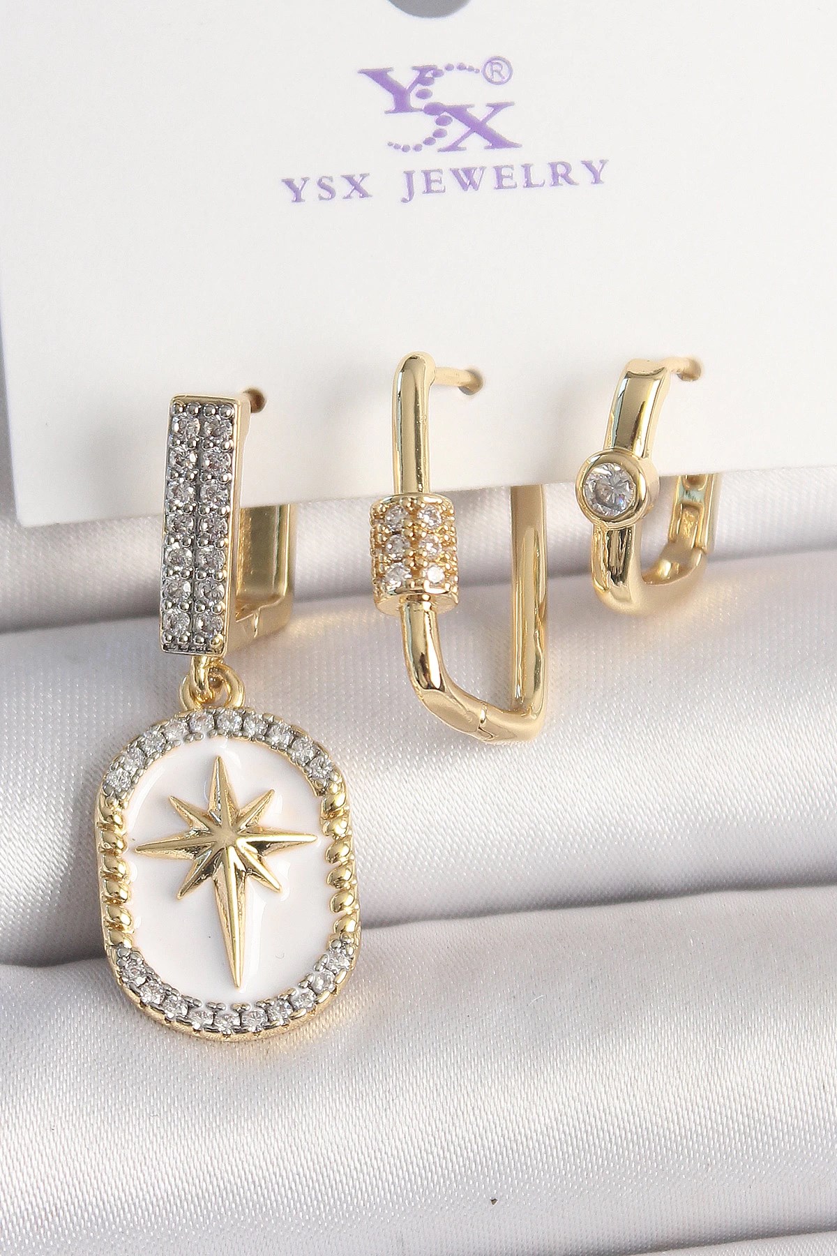 Mey İthalat® Pirinç Zirkon Taşlı Sallantılı Model Gümüş Renk 3'lü Çift Kadın Küpe Set