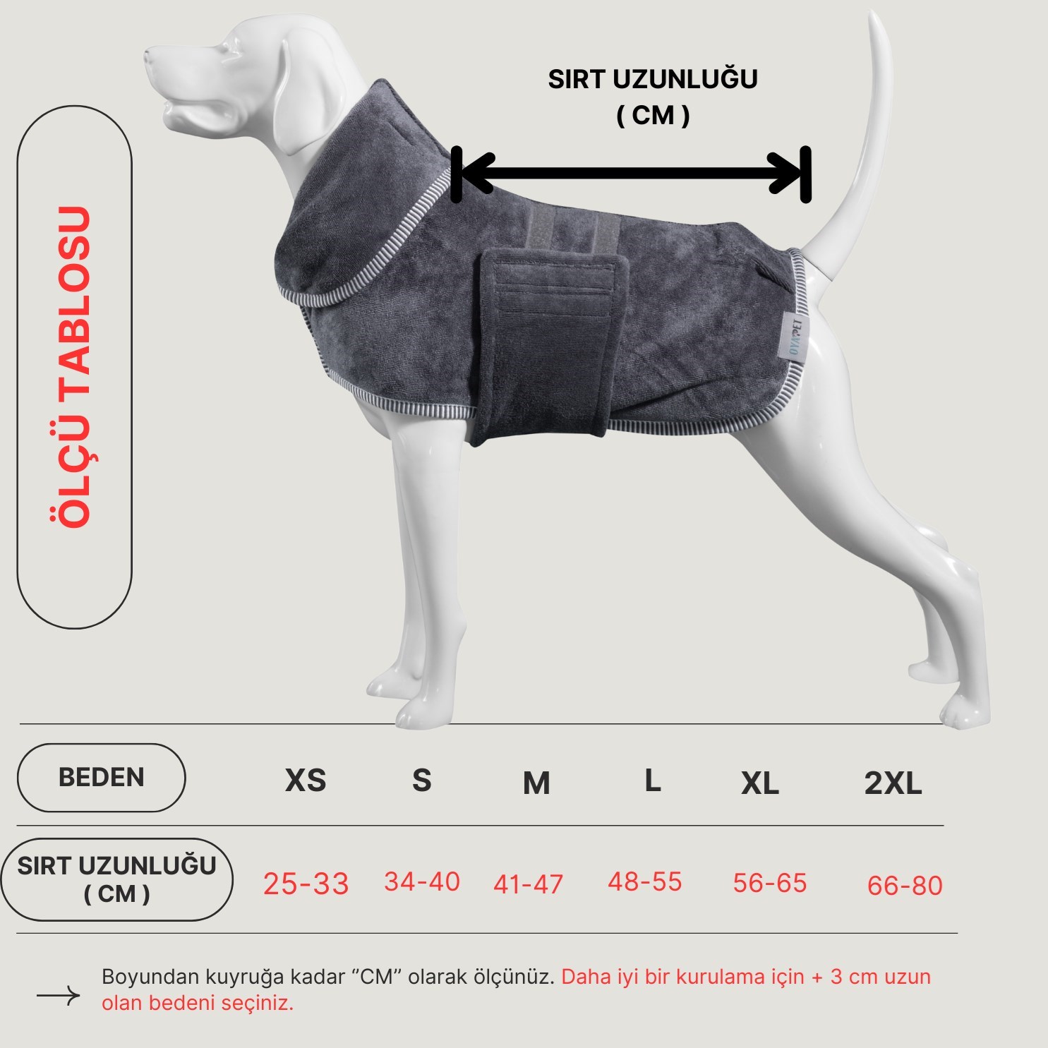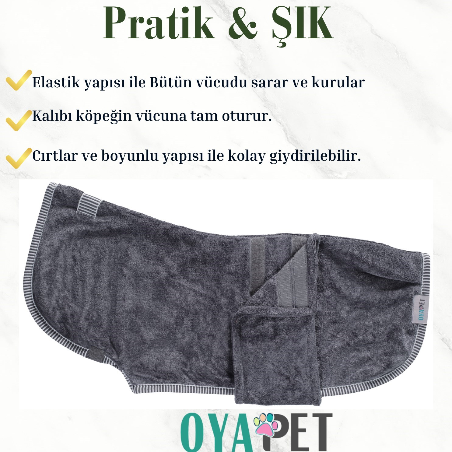 Islak/Nemli köpeğinize bel çevresinde ayarlanabilir cırt bant sayesinde kolay giydirme avantajı sunarken köpeğinizin hızlı kurumasına tanıklık edeceksiniz.