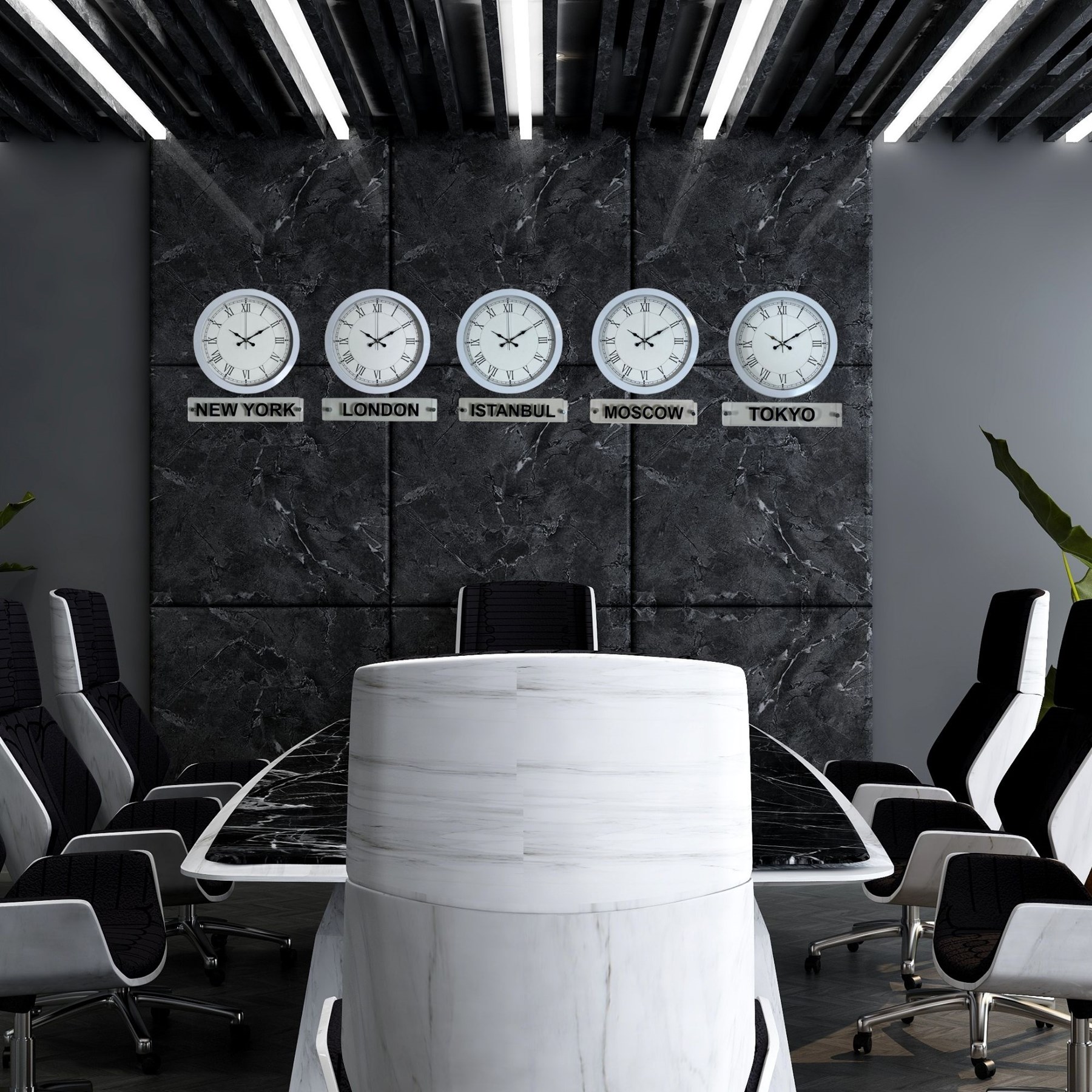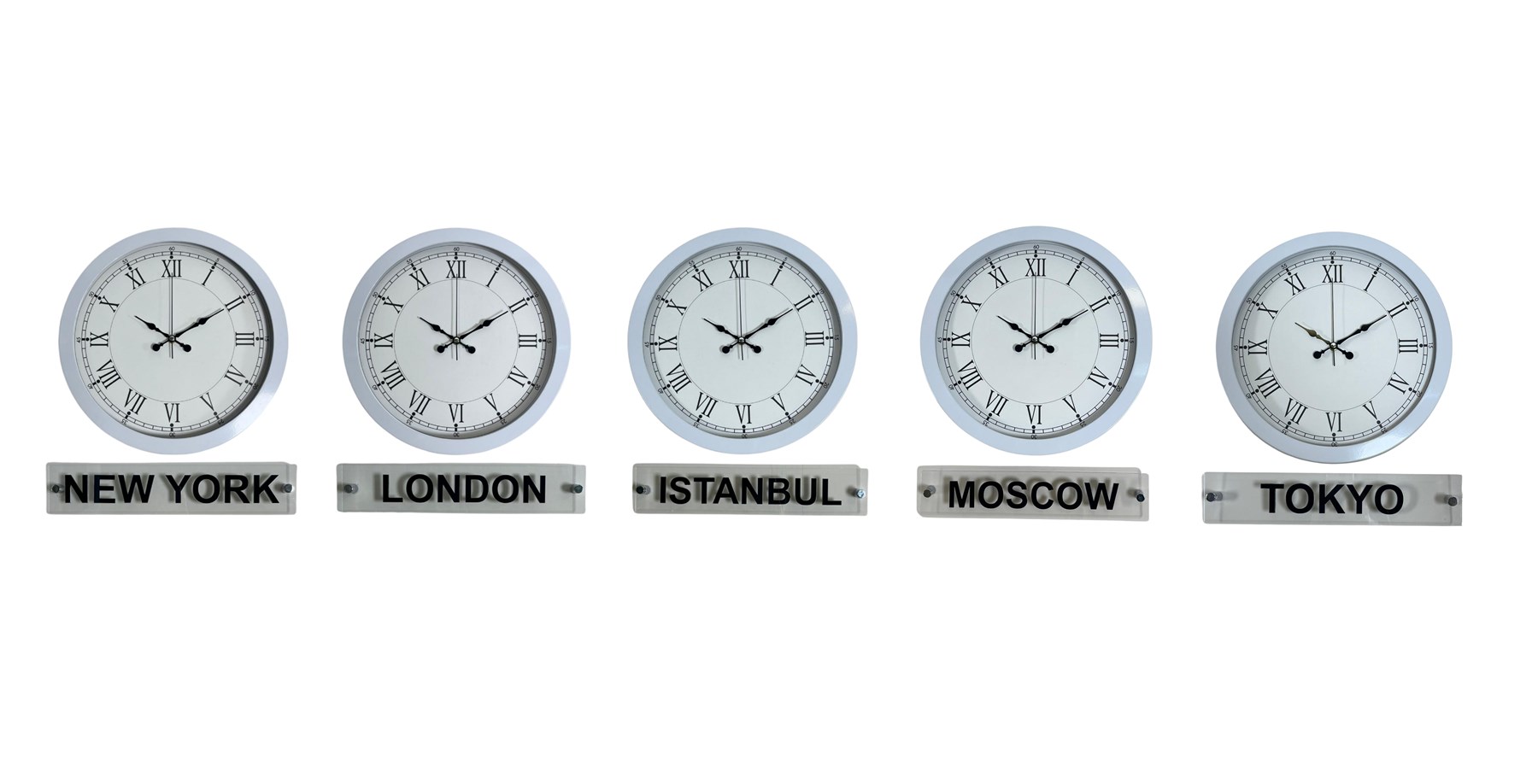 Ofisler, oteller, resepsiyon alanları ve çalışma ortamları için ideal olan bu özel set; New York, London, Istanbul, Moscow ve Tokyo şehirlerini aynı anda takip etme imkânı sunar. Alt kısmında yer alan şeffaf tabelalar, ürüne global ve kurumsal bir kimlik kazandırır.