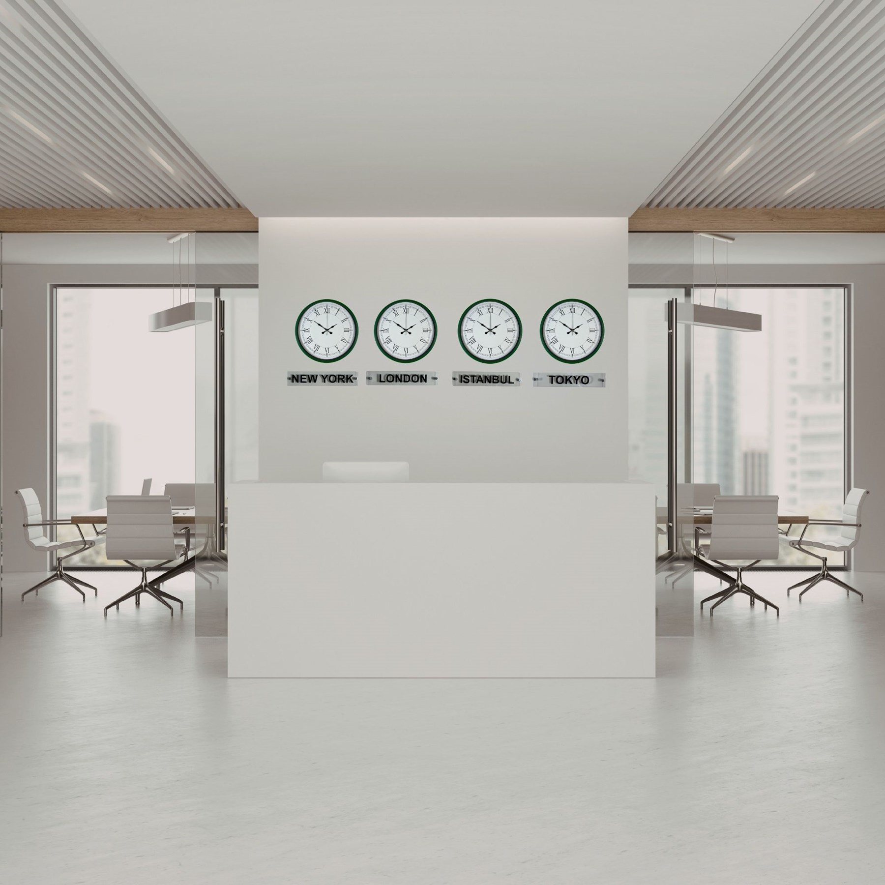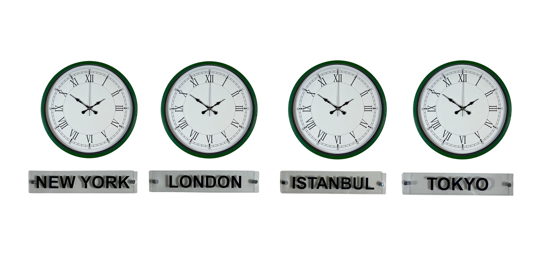 Doğal ve şık görünümüyle öne çıkan 36 cm 4’lü tabelalı yeşil dünya saatleri, bulunduğu ortama ferah ve dengeli bir atmosfer kazandırır. Farklı şehir saatlerini aynı anda takip etme imkânı sunan bu özel set, hem dekoratif hem de işlevsel bir çözüm sunar.