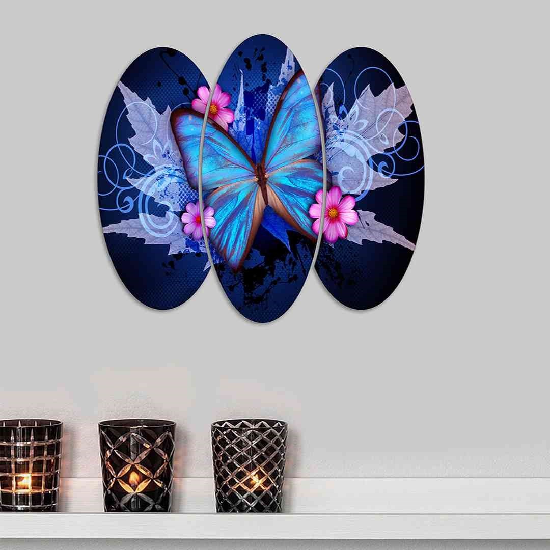 3 Parça Mavi Kelebek Tasarım Mdf Tablo - 3Dikey-147 20X60
