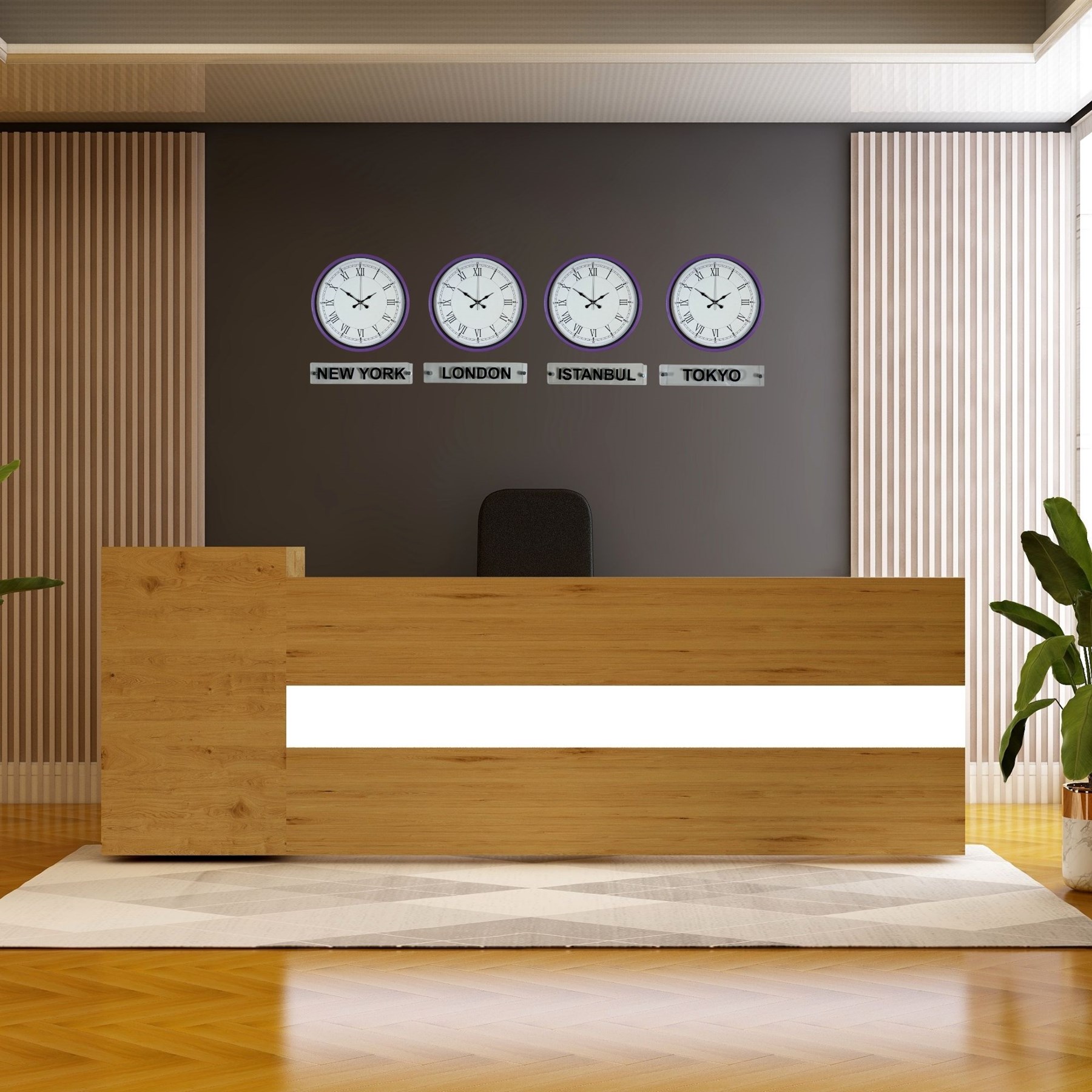Modern tasarımı ve dikkat çekici rengiyle öne çıkan 36 cm 4’lü plastik tabelalı mor dünya saatleri, bulunduğu ortama şık ve farklı bir hava kazandırır. New York, London, Istanbul ve Tokyo saatlerini aynı anda takip etme imkânı sunan bu özel set; ofisler, resepsiyonlar ve çalışma alanları için hem dekoratif hem de işlevsel bir çözümdür.