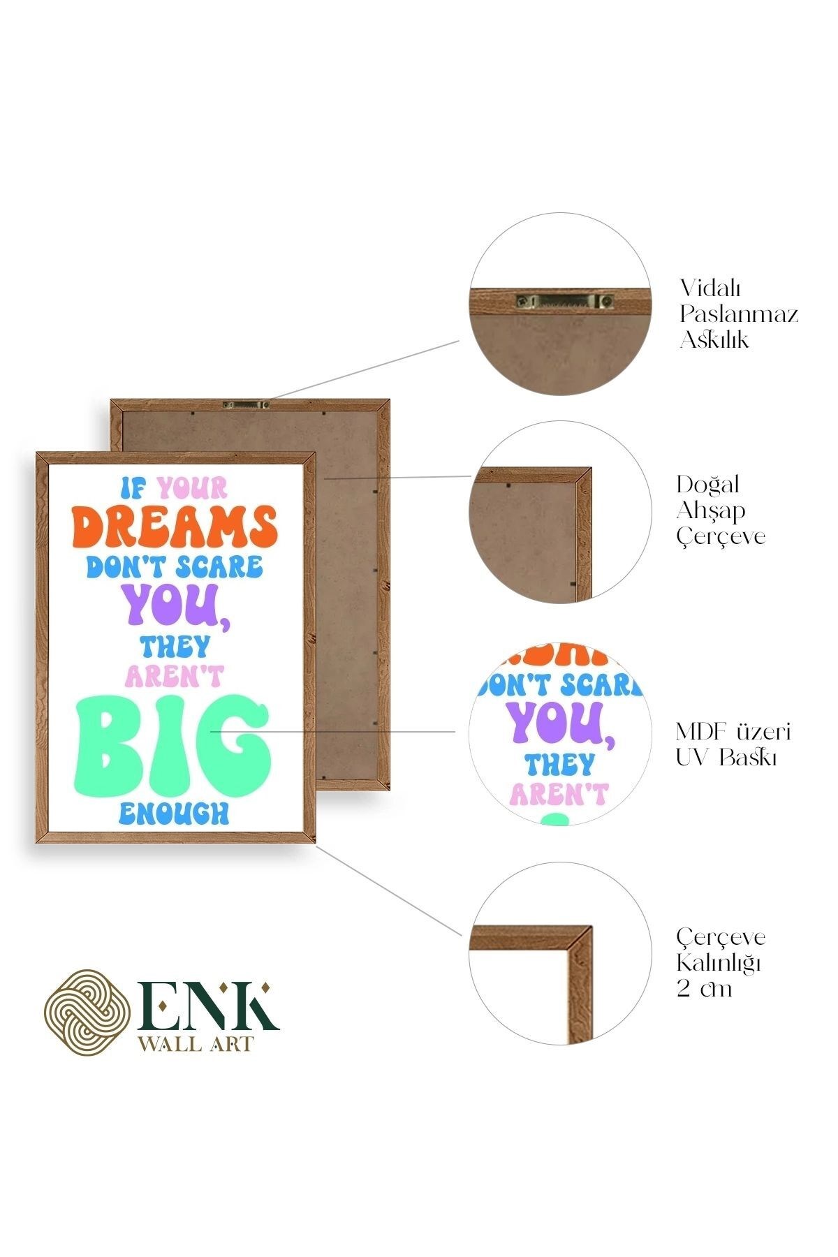 Tablolarımız gerçek ahşap çerçevelidir, çerçeve görünümlü değildir. ; ENK Wall Art Olarak Ahşap Çerçeveli Tablolar Üretiyoruz. ; Tablolarımız tek parça, 3 Parça, 5 Parça ve daha çok kategoride tasarımcılarımız tarafından ev ve ofisleriniz duvarları süslemek için tasarlanmaktadır. ; Ahşap Çerçeveli Duvar Tabloları ile yaşam alanlarınıza yepyeni bir görünüm kazandırın. ; Yıllarca dayanacağından emin olduğumuz sağlam çerçevelere sahip yüksek kaliteli ahşaptan üretilmiştir. ; İster bir köşeyi süslemek isteyin, ister evinizi yenilemek , bu ahşap tablolar herhangi bir yaşam alanına stil ve işlev getirecektir. ; Duvara kolay bir şekilde monte edilir. ; Uzun ömürlü kullanım için sağlam ahşap çerçeveden yapılmış, dayanıklı ve güçlü. ; Duvara monte edilebilir tasarımı, yaşam alanlarında veya yatak odalarında duvara kolayca asılmasını sağlar. ; Pürüzsüz üst yüzeyi temiz kalmayı kolaylaştırır. ; Herhangi bir stile uyacak şekilde çeşitli renklerde gelir. ; Kolay yeniden düzenleme için hafif ve portatif. ; Küçük oturma odaları veya dar alanlar için mükemmel boyut. ; Eve taşınma hediyesi olarak idealdir. ; Herhangi bir evin dekorunu süslemek için harika bir yol. ; Herhangi bir modern veya çağdaş iç tasarıma mükemmel bir katkı. ; Tablo içi 3 mm mdf (ahşap) malzeme üzeri uv baskıdır. ; Renkler canlı ve solma yapmaz. ; Kırılma, bükülme ve çizilmeye karşı dayanıklıdır.;