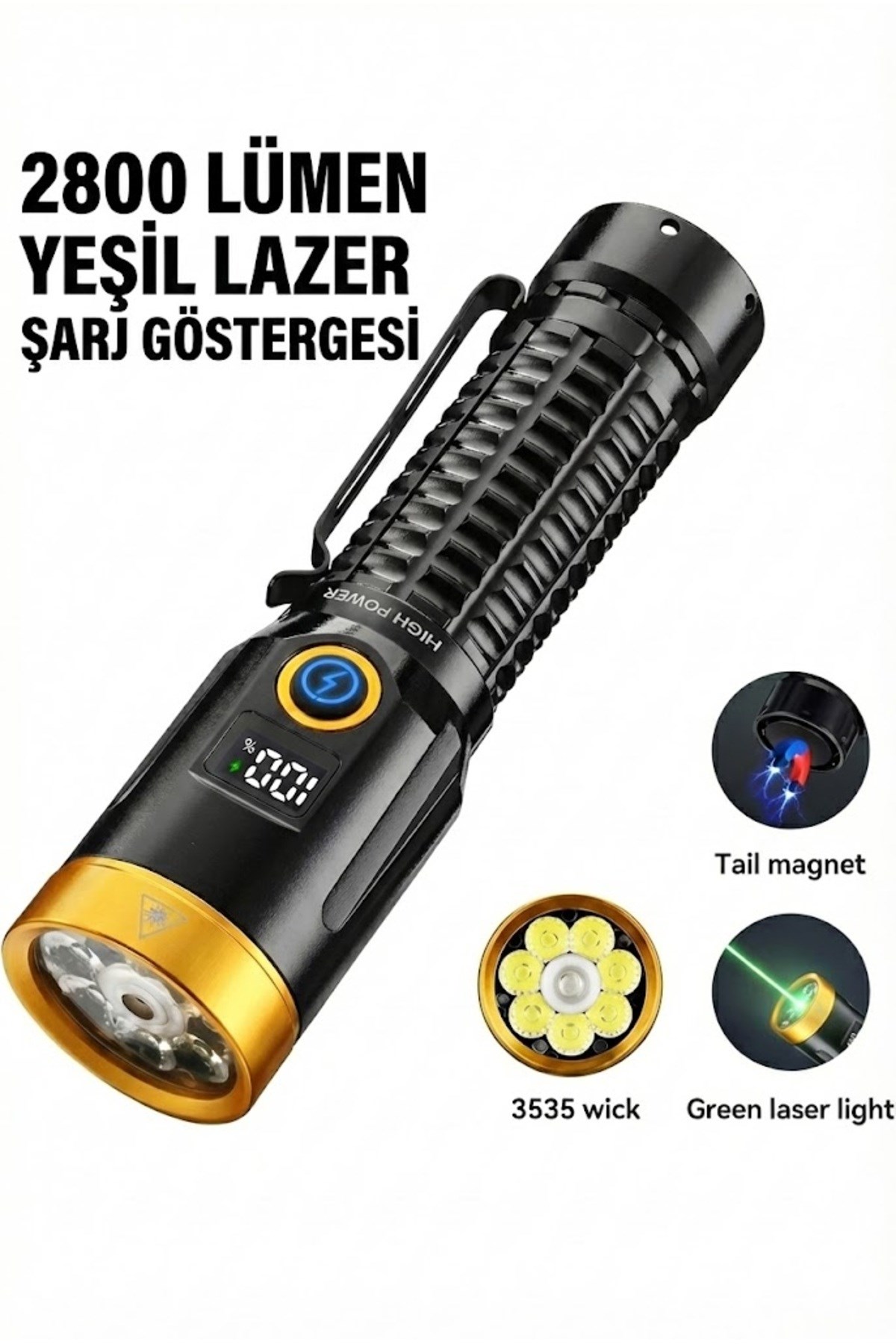 2800 Lümen Yeşil Lazerli Şarjlı El Feneri - Dijital Göstergeli Mıknatıslı Taktik Kamp Feneri