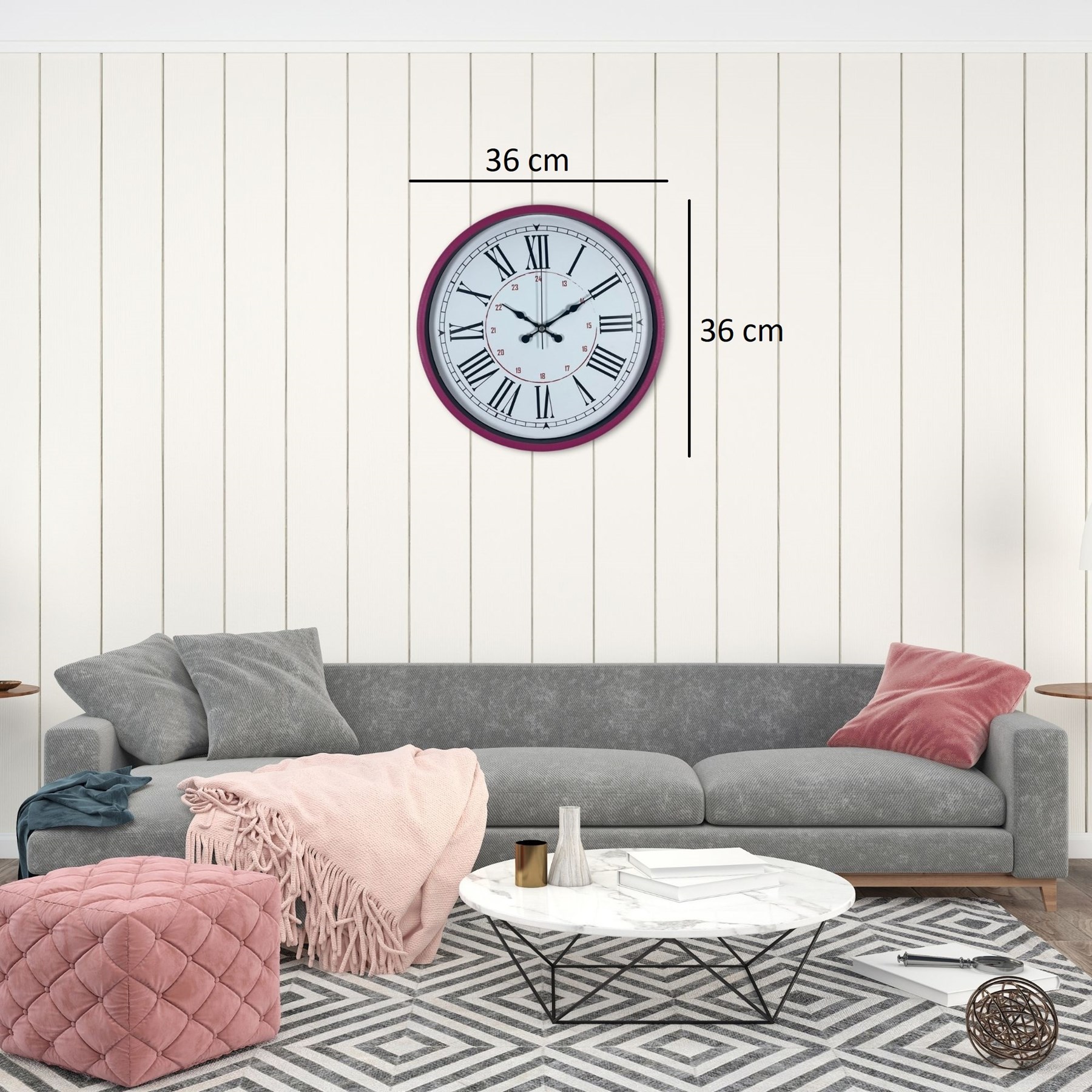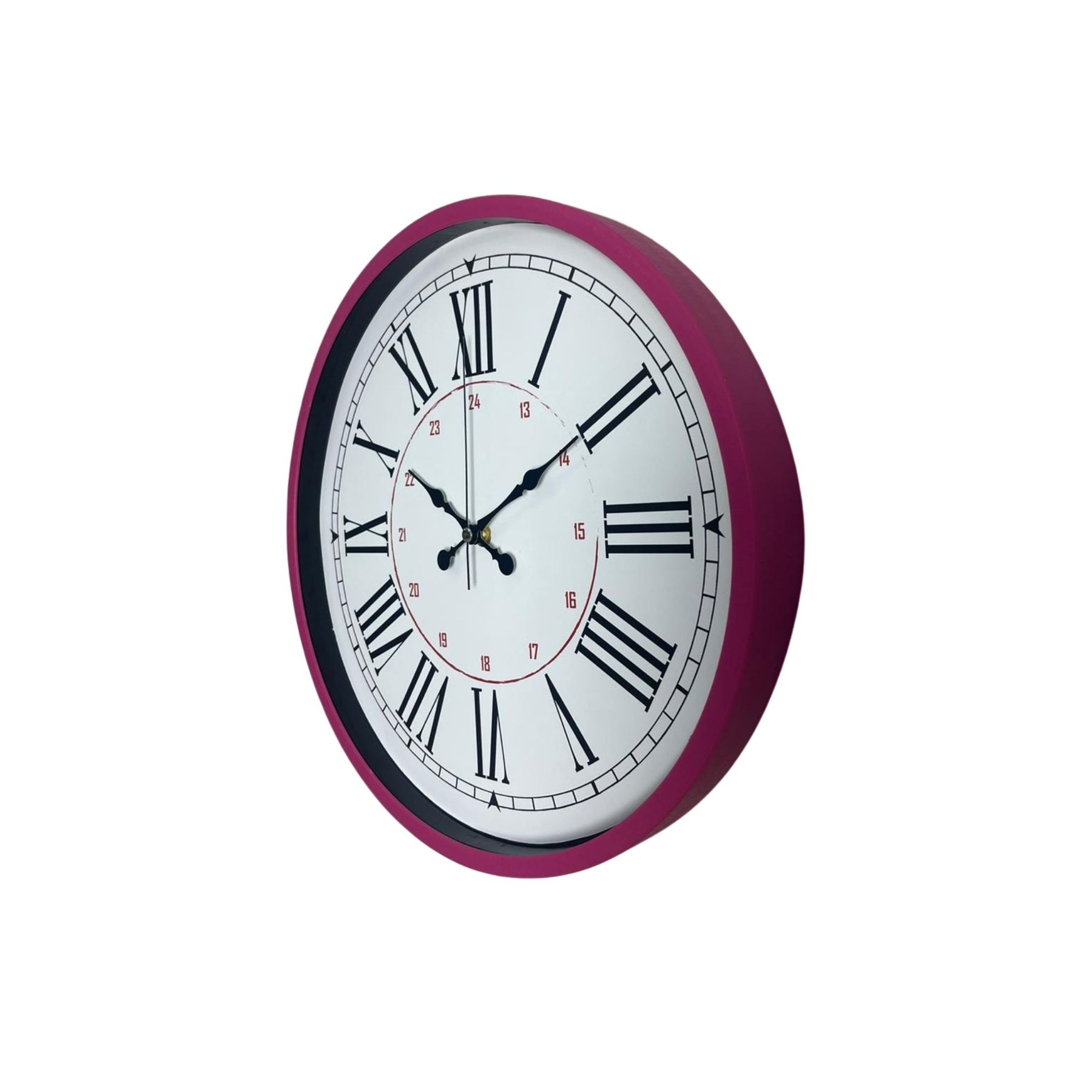 Canlı pembe kasası ve beyaz kadranı ile tasarlanan bu 36 cm duvar saati, klasik Romen rakam detaylarını modern ve enerjik bir renk dokunuşuyla buluşturur. İç bölümde yer alan kırmızı 24 saat göstergesi sayesinde standart saatlerden ayrılır ve daha fonksiyonel bir kullanım sunar.